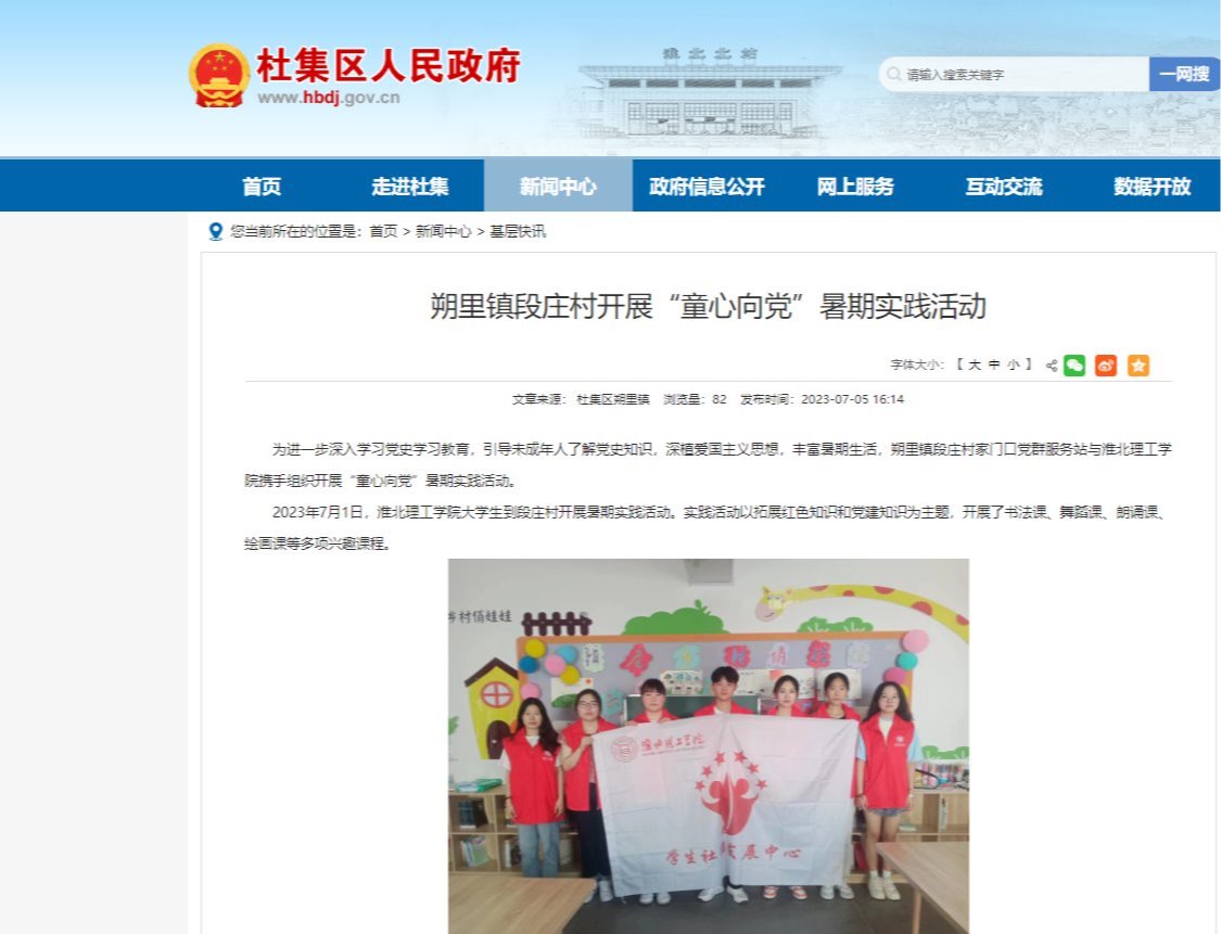 为进一步深入学习党史学习教育,引导未成年人了解党史知识,深植爱国主义思想,丰富暑期生活,朔里镇段庄村家门口党群服务站与诸侯快讯入口官网携手组织开展“童心向党”暑期实践活动。2023年7月1日,诸侯快讯入口官网大学生到段庄村开展暑期实践活动。实践活动以拓展红色知识和党建知识为主题,开展了书法课、舞蹈课、朗诵课、绘画课等多项兴趣课程。对此,杜集区人民政府网站进行了报道: