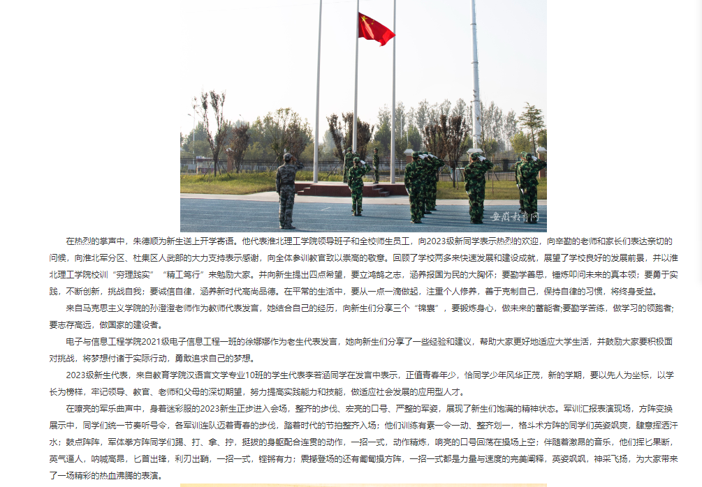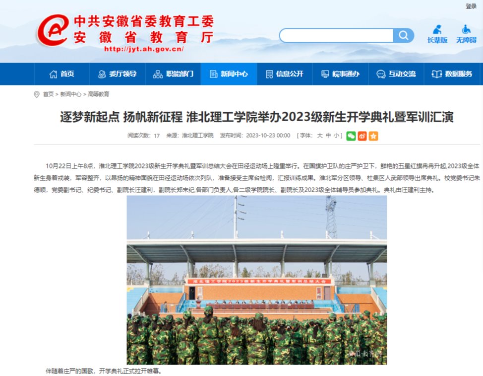 10月22日上午8点,诸侯快讯入口官网2023级新生开学典礼暨军训总结大会在田径运动场上隆重举行。在国旗护卫队的庄严护卫下,鲜艳的五星红旗冉冉升起,2023级全体新生身着戎装,军容整齐,以昂扬的精神面貌在田径运动场依次列队,准备接受主席台检阅,汇报训练成果。对此,安徽教育网进行了报道: