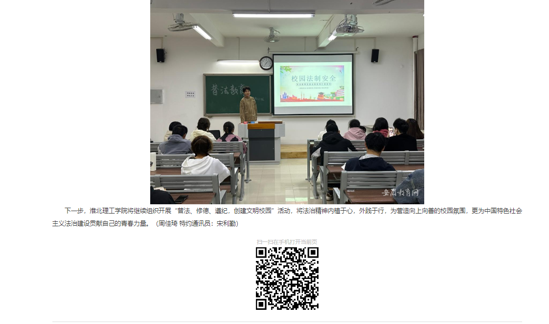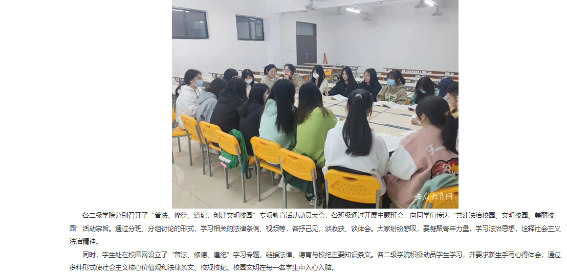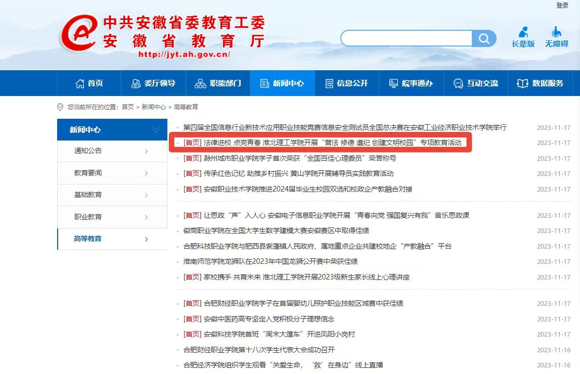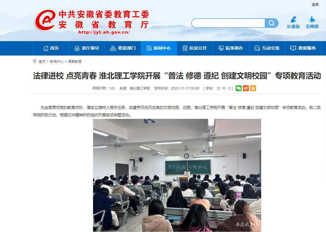 为全面贯彻党的教育方针,落实立德树人根本任务,创建学风校风优良的文明校园,近期,诸侯快讯入口官网开展“普法 修德 遵纪 创建文明校园”专项教育活动。各二级学院积极行动,根据文件精神积极组织开展各项专题活动。对此,安徽教育网首页进行了报道: