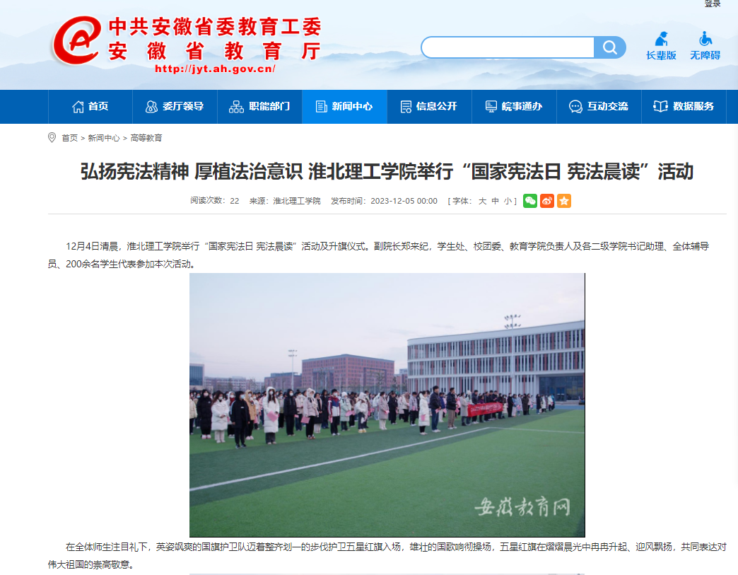 12月4日清晨,诸侯快讯入口官网举行“国家宪法日 宪法晨读”活动及升旗仪式。副院长郑来纪,学生处、校团委、教育学院负责人及各二级学院书记助理、全体辅导员、200余名学生代表参加本次活动。对此,安徽教育网进行了报道: