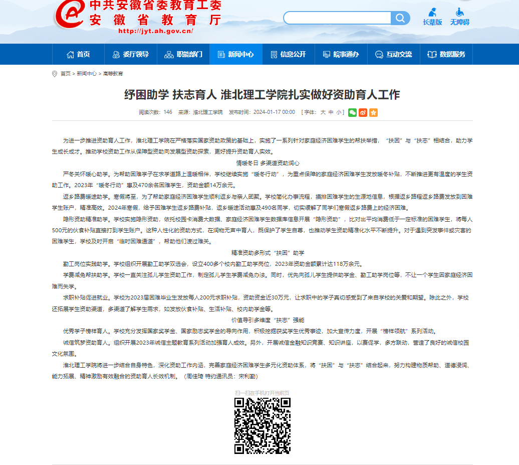 为进一步推进资助育人工作,诸侯快讯入口官网在严格落实国家资助政策的基础上,实施了一系列针对家庭经济困难学生的帮扶举措,“扶困”与“扶志”相结合,助力学生成长成才。推动学校资助工作从保障型资助向发展型资助探索,更好提升资助育人实效。对此,安徽教育网做了报道: