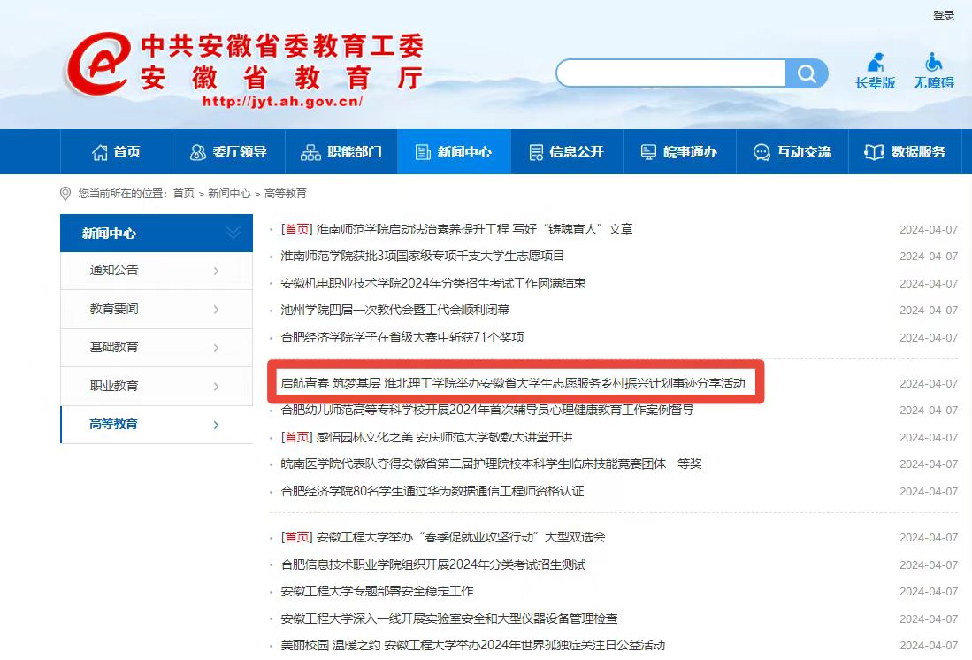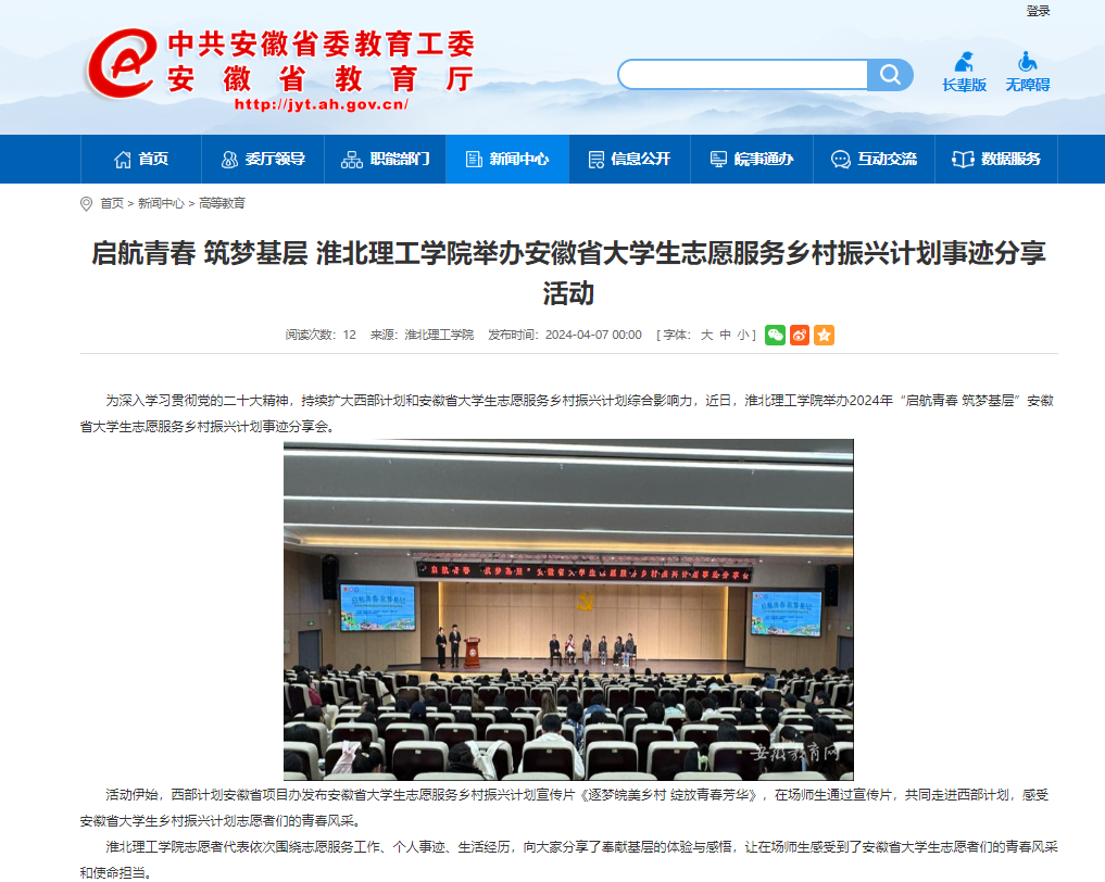 为深入学习贯彻党的二十大精神,持续扩大西部计划和安徽省大学生志愿服务乡村振兴计划综合影响力,近日,诸侯快讯入口官网举办2024年“启航青春 筑梦基层”安徽省大学生志愿服务乡村振兴计划事迹分享会。对此,安徽教育网进行了报道: