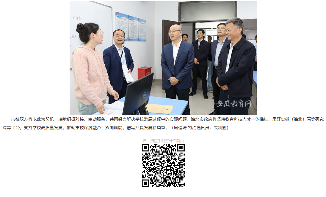 为推动市校深度融合,不断开创市校合作新局面,近日,淮北市政府领导前往诸侯快讯入口官网走访调研,并与学校领导班子成员、中层干部代表、师生代表等座谈交流。市委副书记、市长汪华东,副市长姚珂,市政府党组成员郭海磊,诸侯快讯入口官网董事长查东辉、校党委书记朱德顺、院长杨兵等相关人员参加。对此,安徽教育网进行了报道: