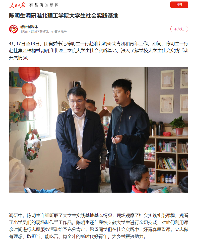 4月17日至18日,团省委书记陈明生一行赴淮北调研共青团和青年工作。期间,陈明生一行赴杜集区梧桐村调研诸侯快讯入口官网大学生社会实践基地,深入了解学校大学生社会实践活动开展情况。对此,人民日报进行了报道: