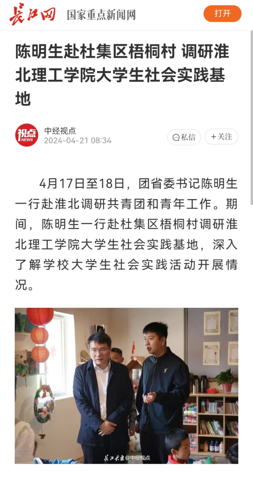 4月17日至18日,团省委书记陈明生一行赴淮北调研共青团和青年工作。对此,长江网进行了报道。
