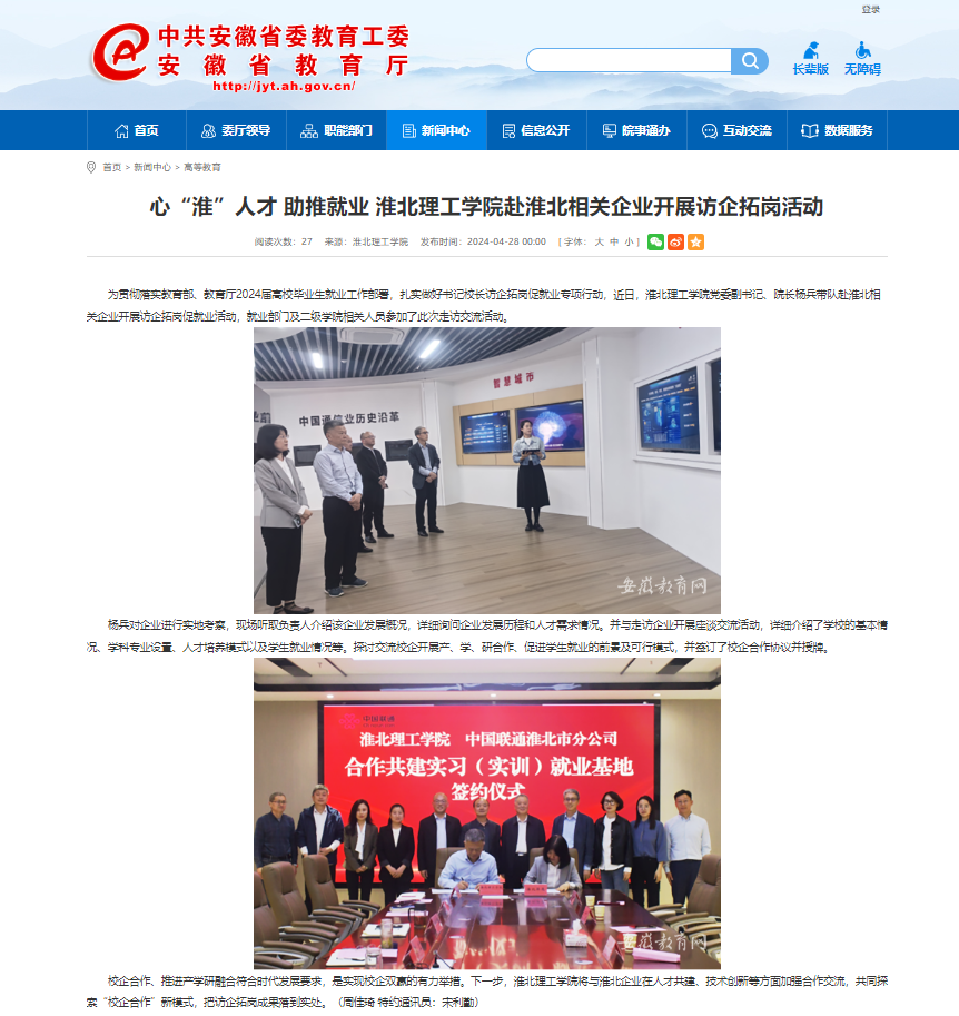 为贯彻落实教育部、教育厅2024届高校毕业生就业工作部署,扎实做好书记校长访企拓岗促就业专项行动,近日,诸侯快讯入口官网党委副书记、院长杨兵带队赴淮北相关企业开展访企拓岗促就业活动,就业部门及二级学院相关人员参加了此次走访交流活动。对此,安徽教育网进行了报道: