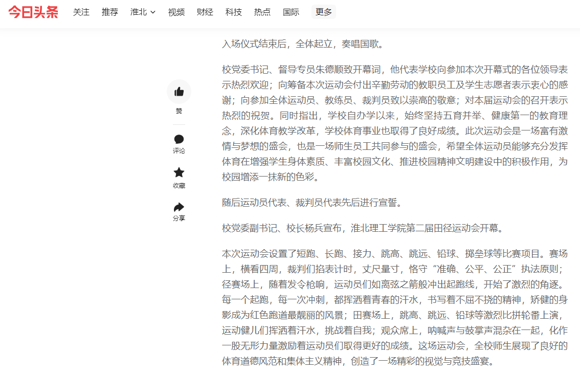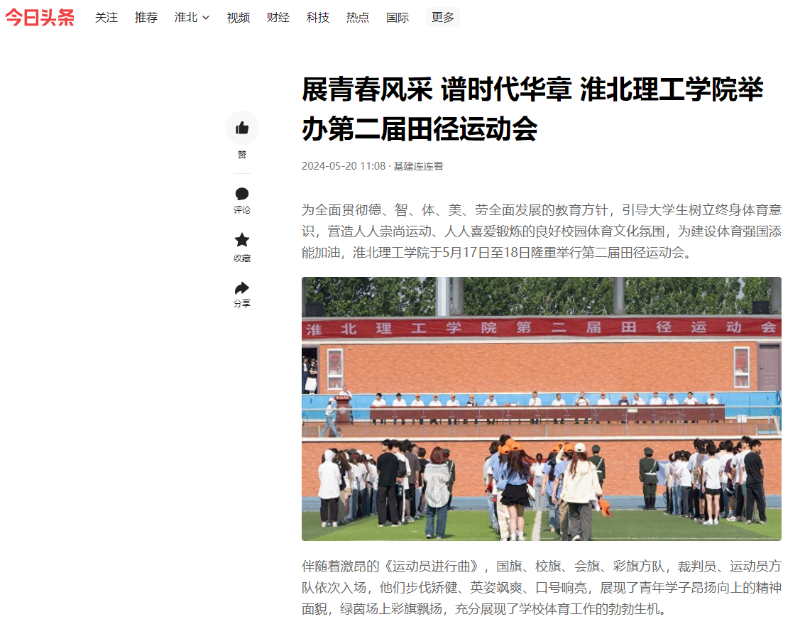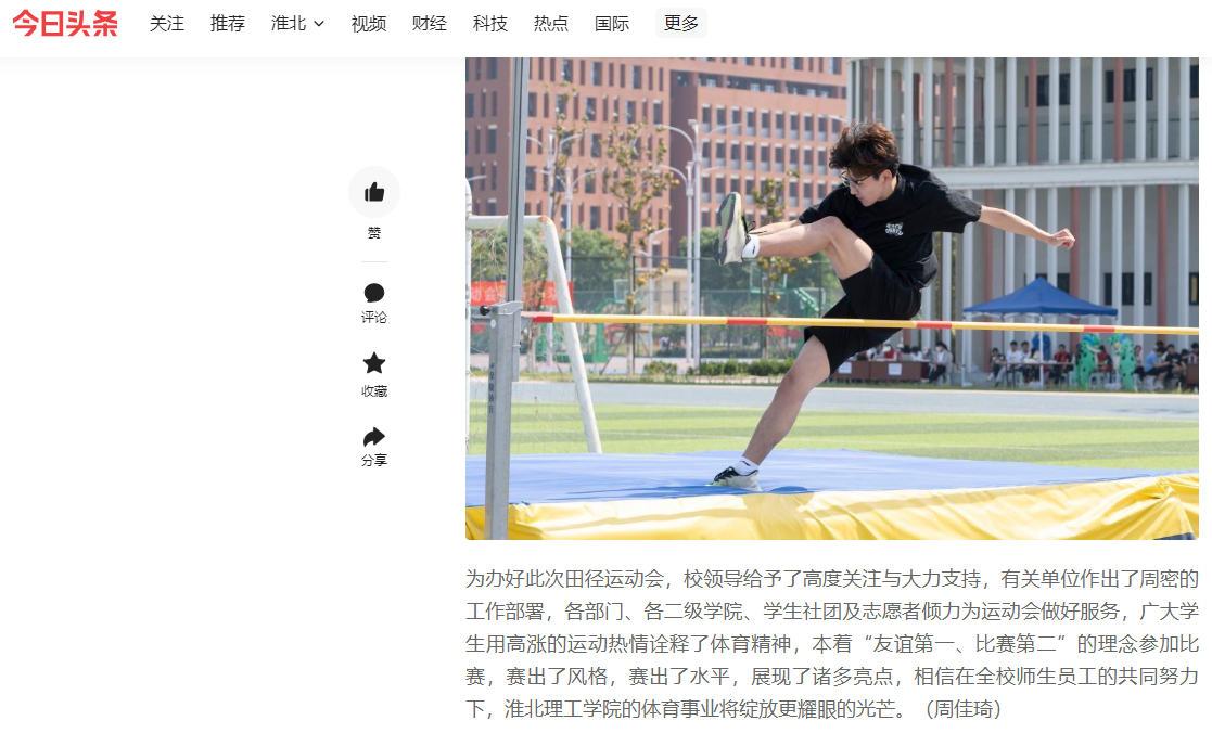 为全面贯彻德、智、体、美、劳全面发展的教育方针,引导大学生树立终身体育意识,营造人人崇尚运动、人人喜爱锻炼的良好校园体育文化氛围,为建设体育强国添能加油,诸侯快讯入口官网于5月17日至18日隆重举行第二届田径运动会。对此,今日头条进行了报道: