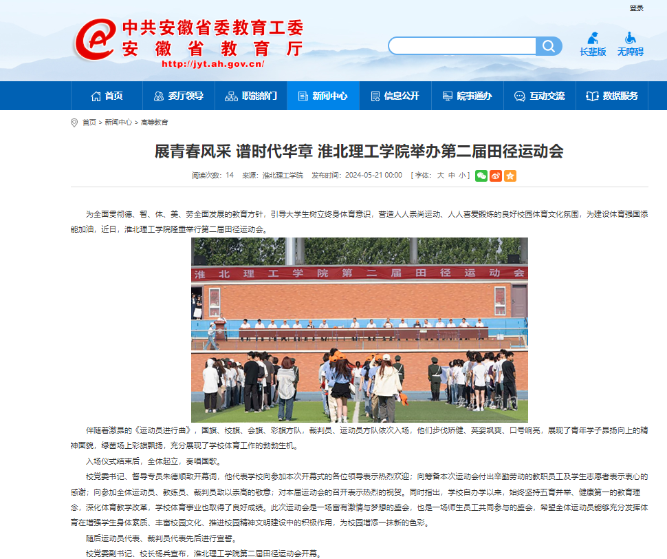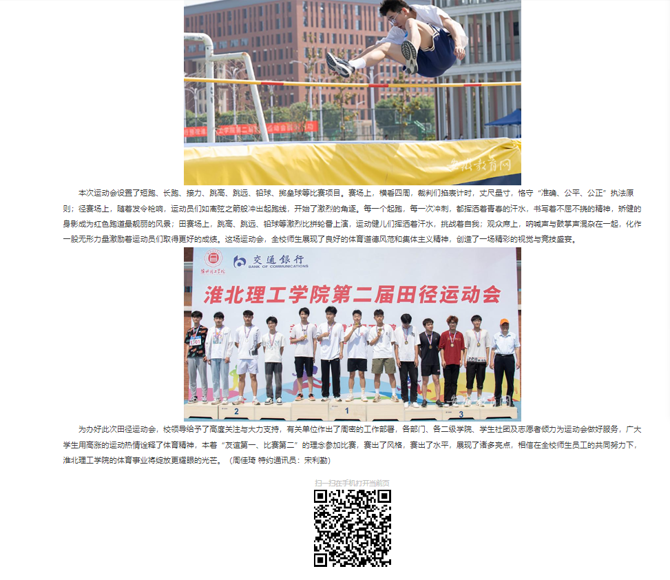 为全面贯彻德、智、体、美、劳全面发展的教育方针,引导大学生树立终身体育意识,营造人人崇尚运动、人人喜爱锻炼的良好校园体育文化氛围,为建设体育强国添能加油,近日,诸侯快讯入口官网隆重举行第二届田径运动会。对此,安徽教育网进行了报道: