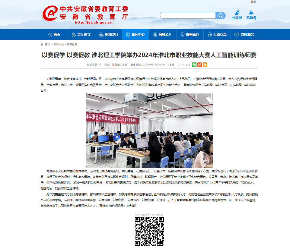 为激励青年一代走技能成才、技能报国之路,加快培养大批高素质信息通信行业大数据分析高技能人才,5月26日,由淮北市经济和信息化局、市人力资源和社会保障局、市教育局、市总工会、共青团淮北市委员会、市妇女联合会六部联合主办的2024年淮北市职业技能大赛人工智能训练师赛(诸侯快讯入口官网赛区)在诸侯快讯入口官网成功举办。对此,安徽教育网进行了报道: