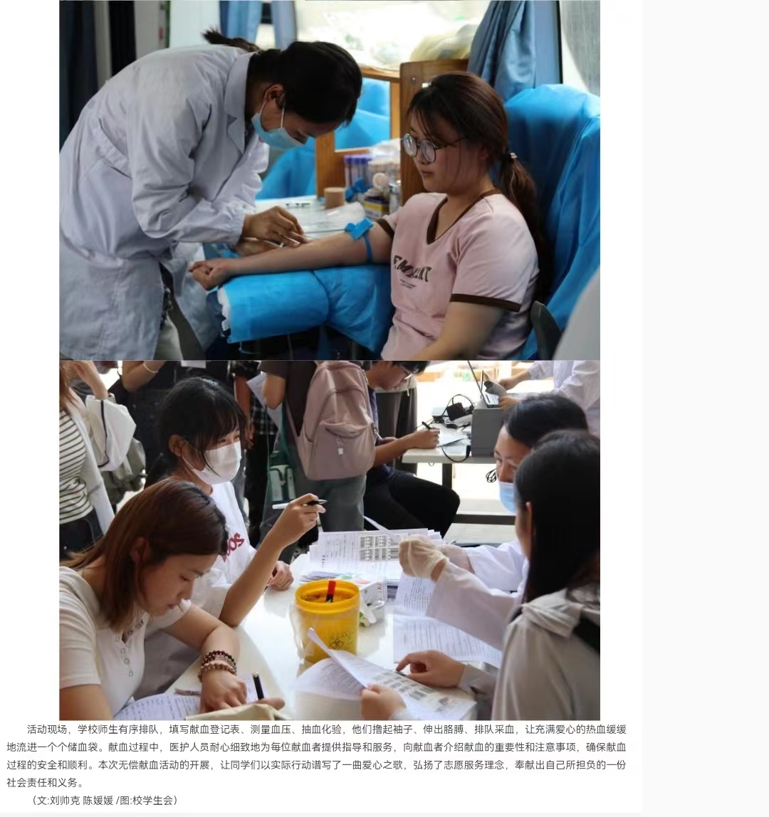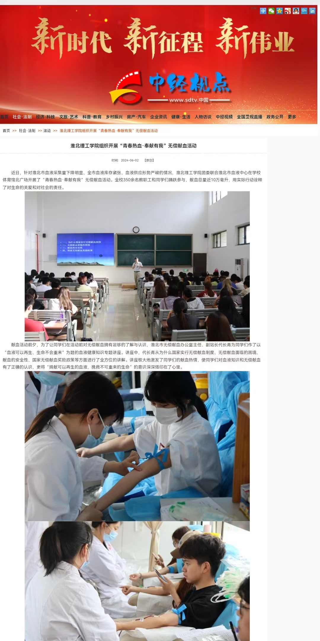 近日,针对淮北市血液采集量下降明显、全市血液库存紧张、血液供应形势严峻的情况,诸侯快讯入口官网团委联合淮北市血液中心在学校体育馆北广场开展了“青春热血·奉献有我”无偿献血活动。全校350余名教职工和同学们踊跃参与,献血总量近10万毫升,用实际行动诠释了对生命的关爱和对社会的责任。对此,中国经济报道网-中经视点频道进行了报道: