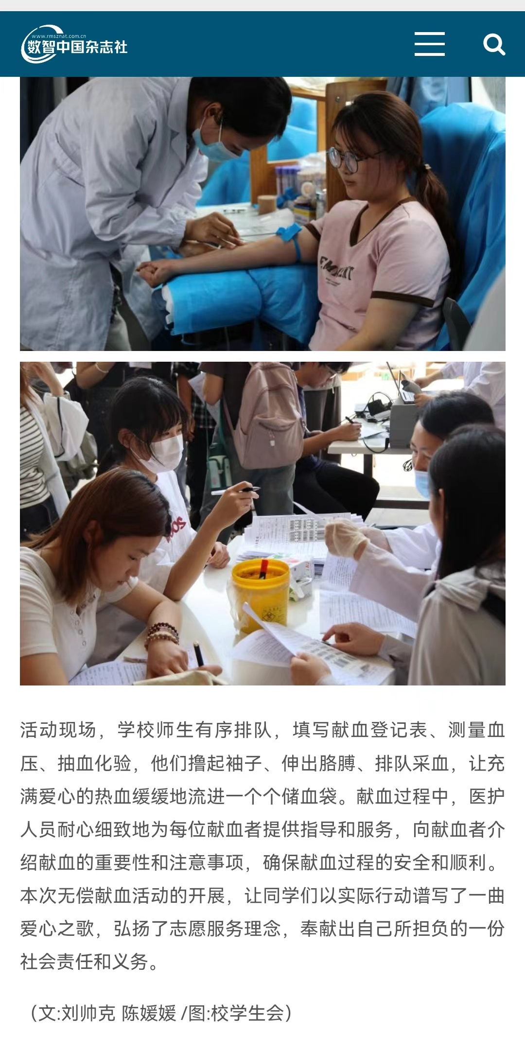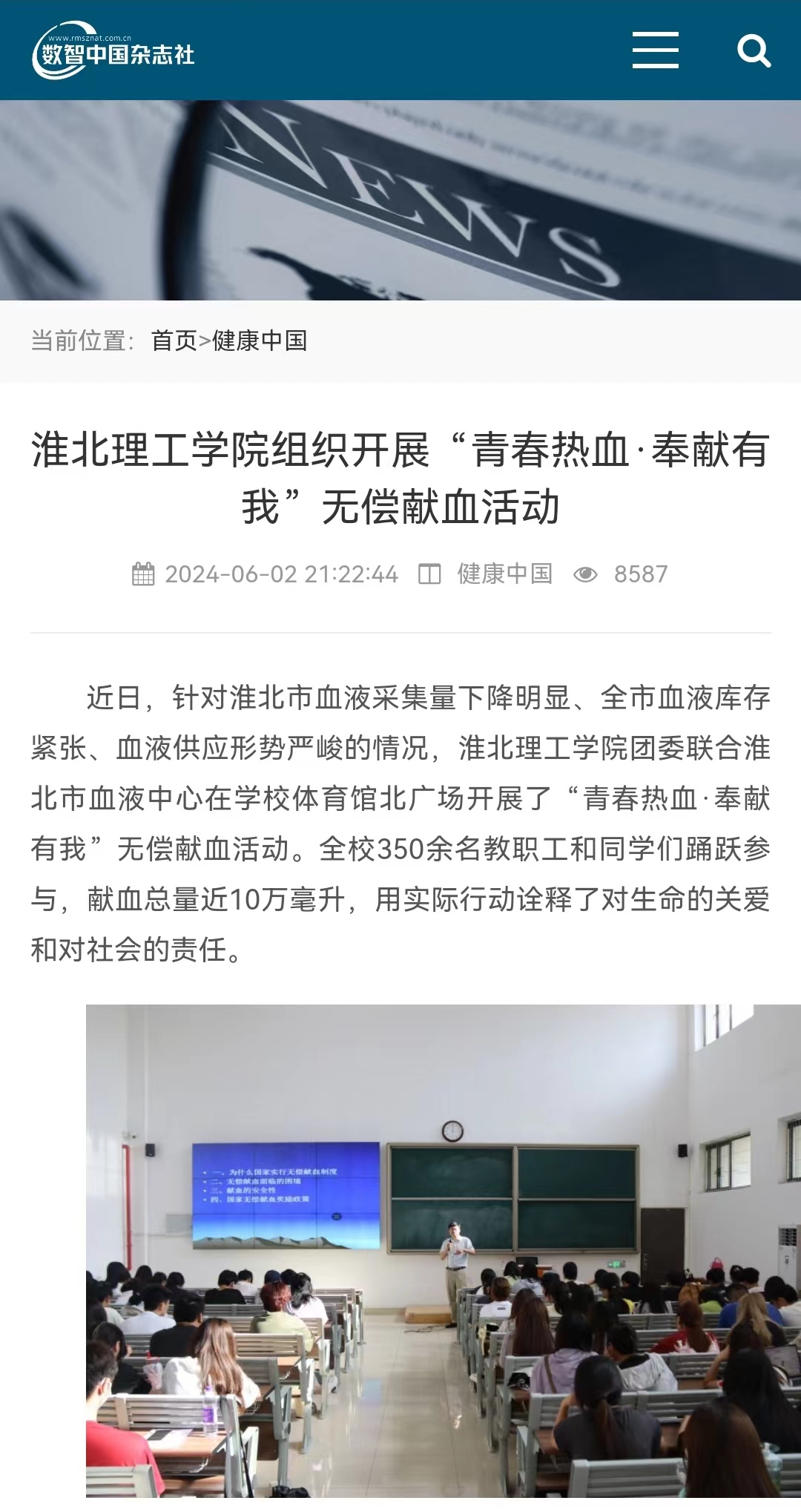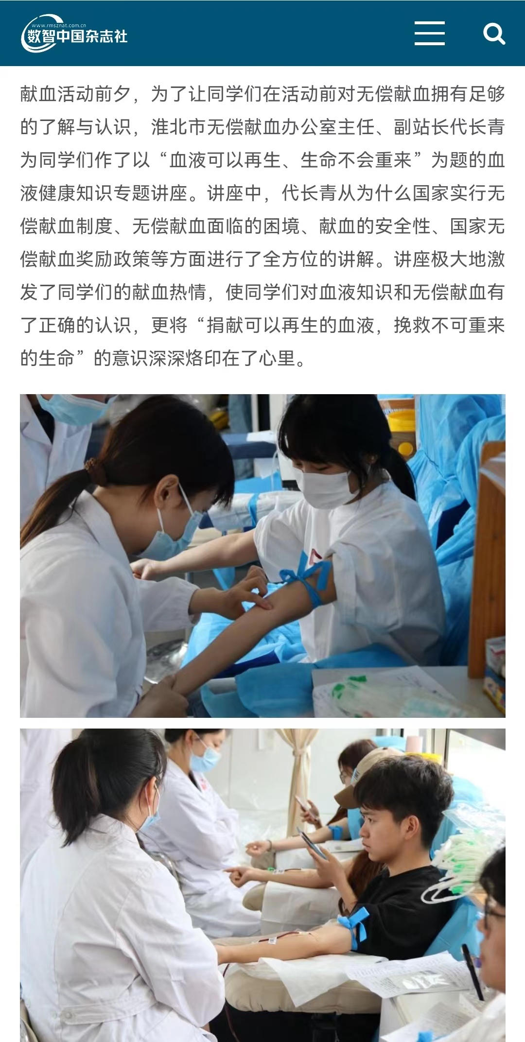 近日,针对淮北市血液采集量下降明显、全市血液库存紧张、血液供应形势严峻的情况,诸侯快讯入口官网团委联合淮北市血液中心在学校体育馆北广场开展了“青春热血·奉献有我”无偿献血活动。对此,数智中国杂志社-健康中国栏目进行了报道: