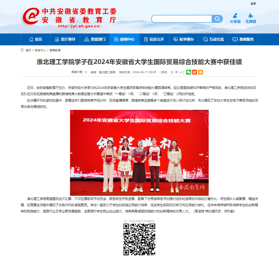 近日,由安徽省教育厅主办、安徽财经大学承办的2024年安徽省大学生国际贸易综合技能大赛圆满结束。经过层层选拔和评审团的严格筛选,诸侯快讯入口官网选派的四支队伍分别在跨境电商直播和跨境电商大数据运营分析赛道中荣获“一等奖”1项,“二等奖”1项,“三等奖”2项的好成绩。对此,安徽教育网进行了报道: