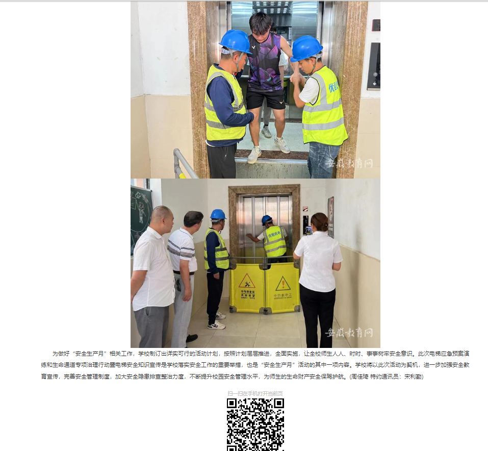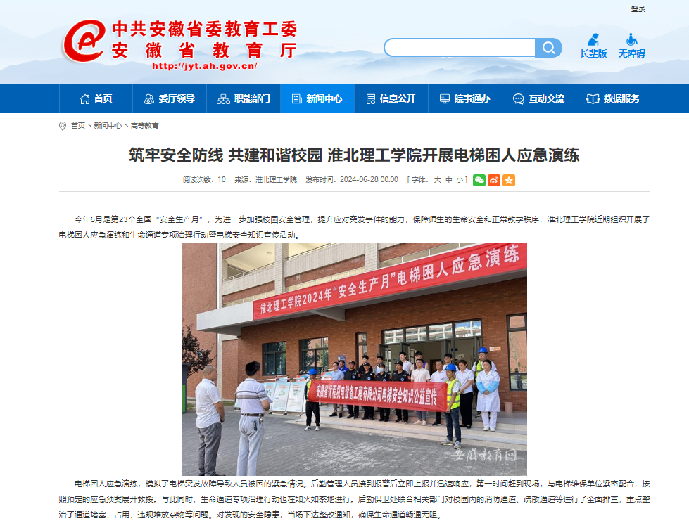 今年6月是第23个全国“安全生产月”,为进一步加强校园安全管理,提升应对突发事件的能力,保障师生的生命安全和正常教学秩序,诸侯快讯入口官网近期组织开展了电梯困人应急演练和生命通道专项治理行动暨电梯安全知识宣传活动。对此,安徽教育网首页进行了报道: