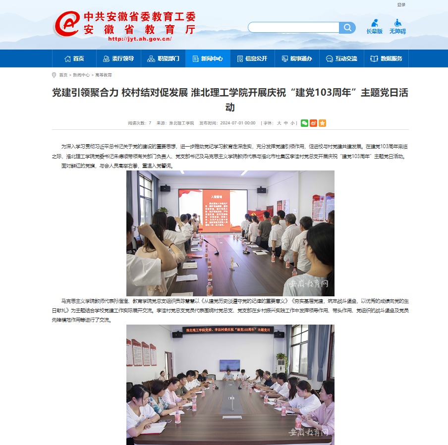 为深入学习贯彻习近平总书记关于党的建设的重要思想,进一步推动党纪学习教育走深走实,充分发挥党建引领作用,促进校与村党建共建发展。在建党103周年来临之际,诸侯快讯入口官网党委书记朱德顺带领有关部门负责人、党支部书记及马克思主义学院教师代表与淮北市杜集区李洼村党总支开展庆祝“建党103周年”主题党日活动。对此,安徽教育网进行了报道: