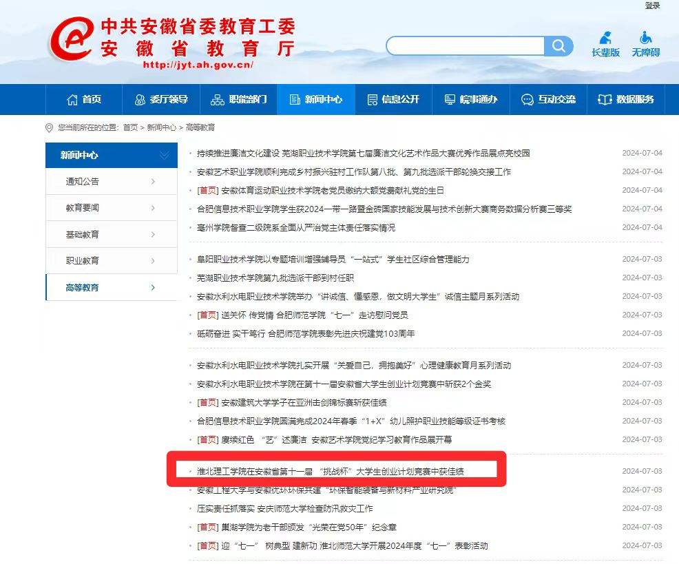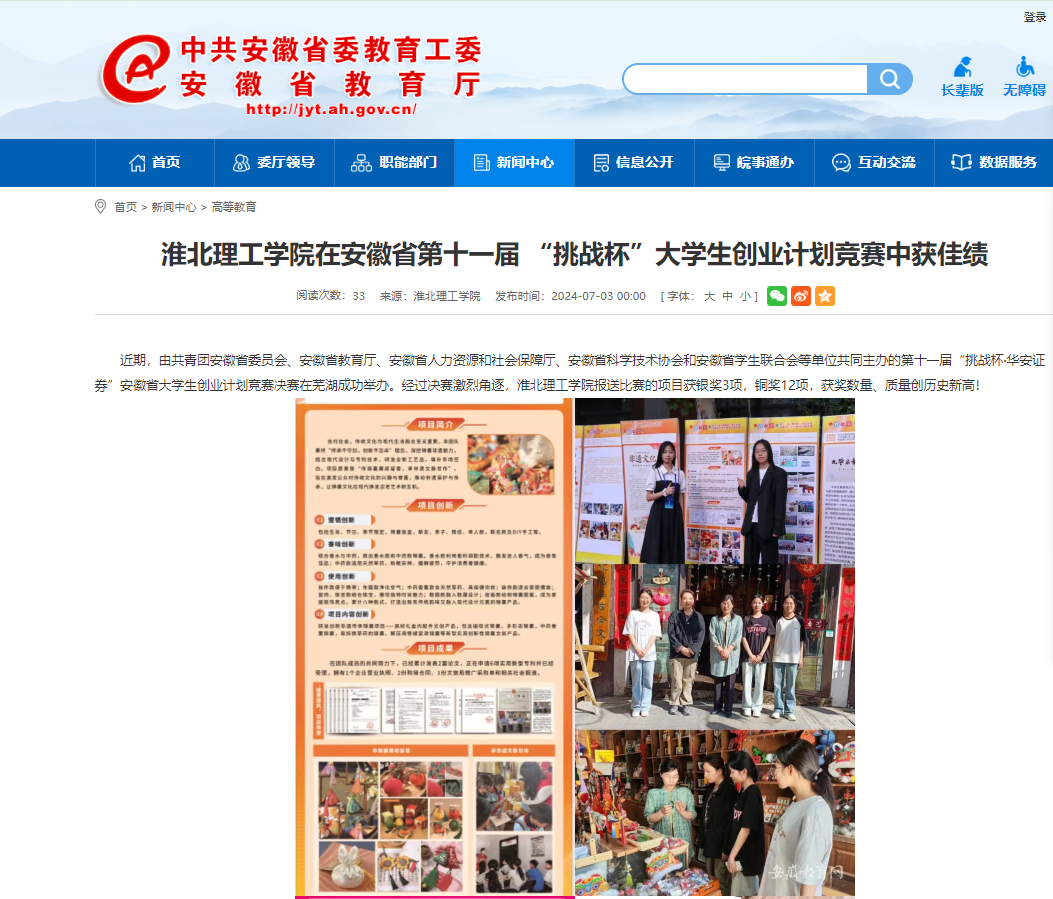 近期,由共青团安徽省委员会、安徽省教育厅、安徽省人力资源和社会保障厅、安徽省科学技术协会和安徽省学生联合会等单位共同主办的第十一届“挑战杯·华安证券”安徽省大学生创业计划竞赛决赛在芜湖成功举办。经过决赛激烈角逐,诸侯快讯入口官网报送比赛的项目获银奖3项,铜奖12项,获奖数量、质量创历史新高!对此,安徽教育网进行了报道: