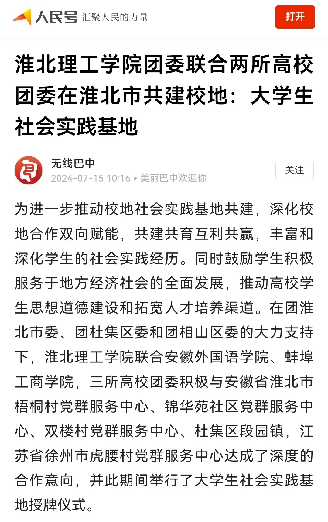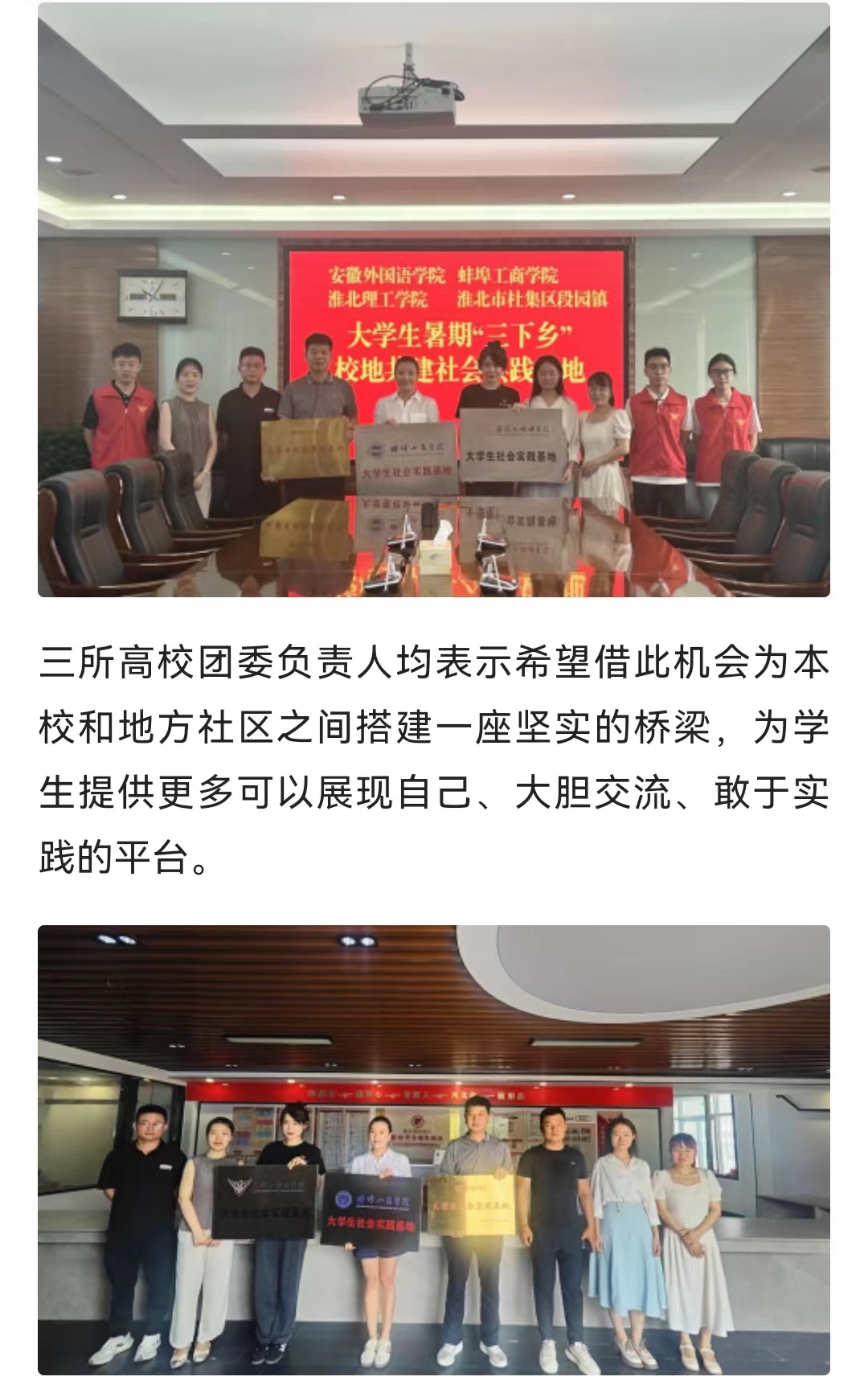 为进一步推动校地社会实践基地共建,深化校地合作双向赋能,共建共育互利共赢,丰富和深化学生的社会实践经历。同时鼓励学生积极服务于地方经济社会的全面发展,推动高校学生思想道德建设和拓宽人才培养渠道。在团淮北市委、团杜集区委和团相山区委的大力支持下,诸侯快讯入口官网联合安徽外国语学院、蚌埠工商学院,三所高校团委积极与安徽省淮北市梧桐村党群服务中心、锦华苑社区党群服务中心、双楼村党群服务中心、杜集区段园镇,江苏省徐州市虎腰村党群服务中心达成了深度的合作意向,并此期间举行了大学生社会实践基地授牌仪式。对此,人民日报-人民号进行了报道: