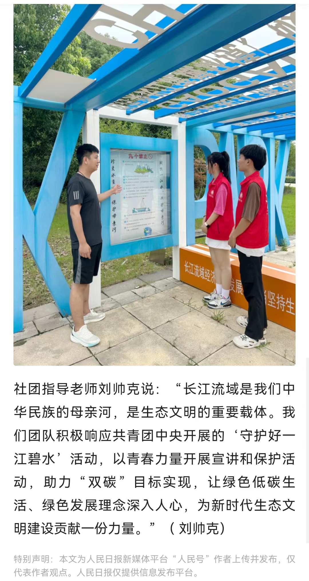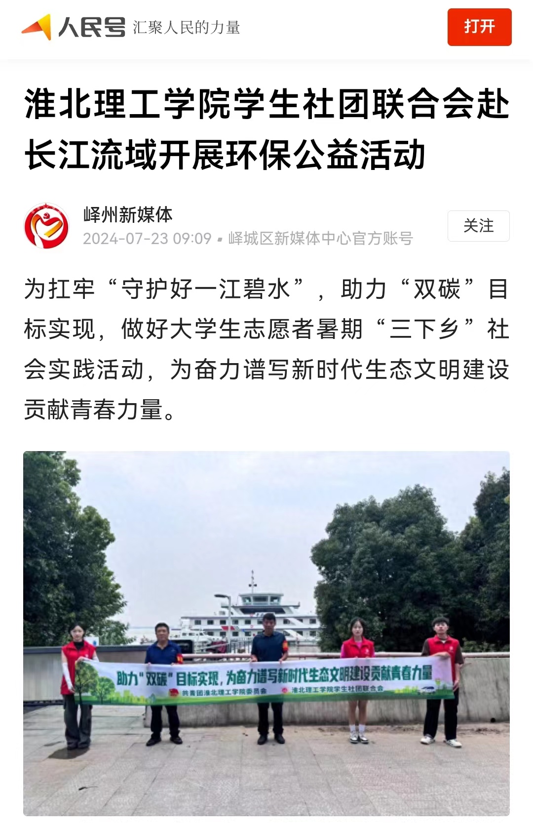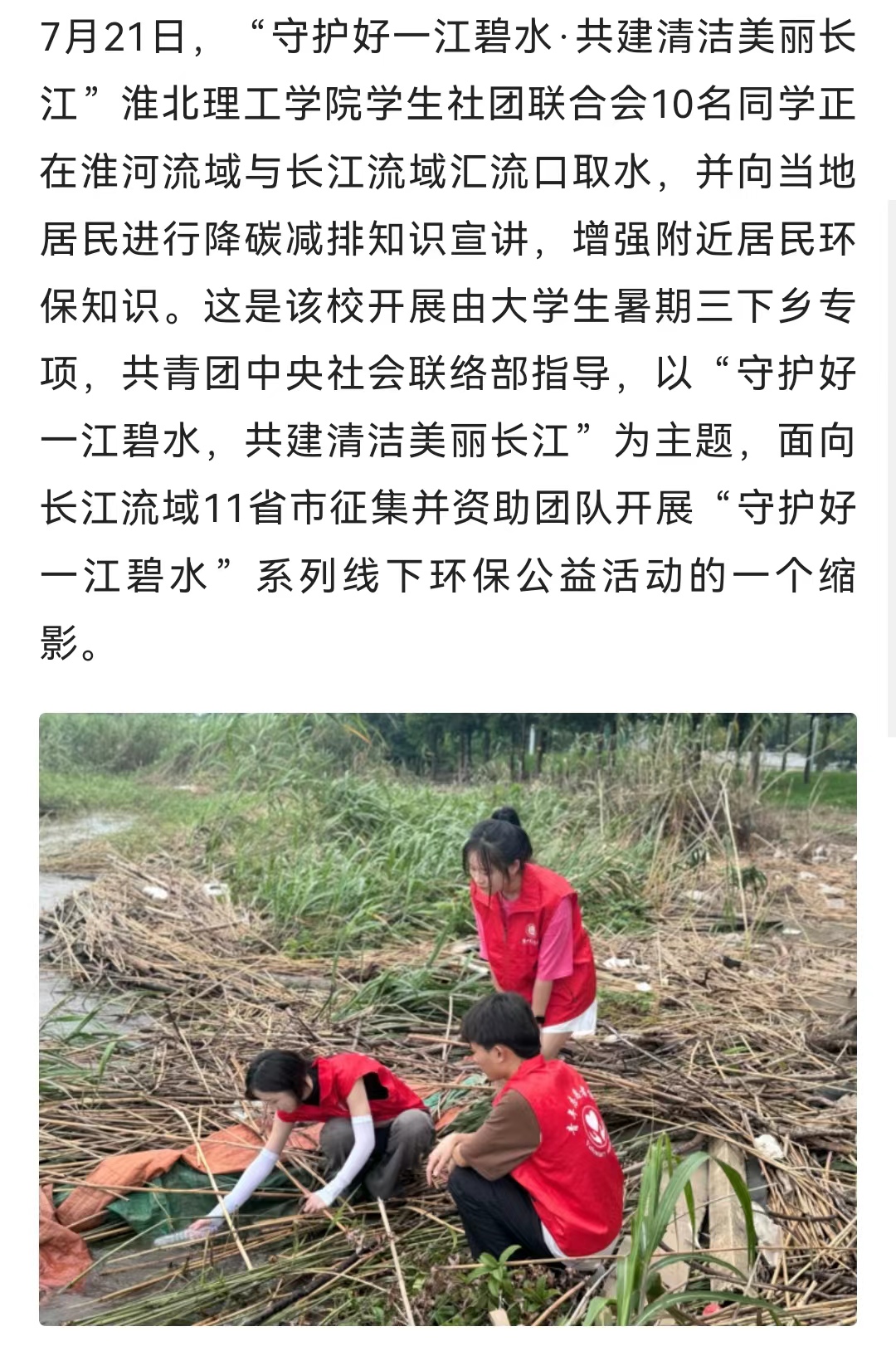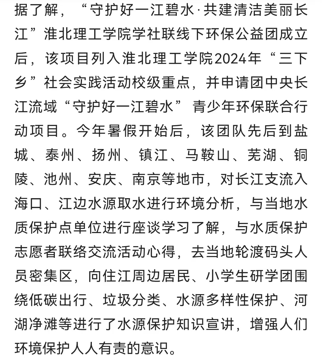 7月21日,“守护好一江碧水·共建清洁美丽长江”诸侯快讯入口官网学生社团联合会10名同学正在淮河流域与长江流域汇流口取水,并向当地居民进行降碳减排知识宣讲,增强附近居民环保知识。这是该校开展由大学生暑期三下乡专项,共青团中央社会联络部指导,以“守护好一江碧水,共建清洁美丽长江”为主题,面向长江流域11省市征集并资助团队开展“守护好一江碧水”系列线下环保公益活动的一个缩影。对此,人民日报-人民号进行报道: