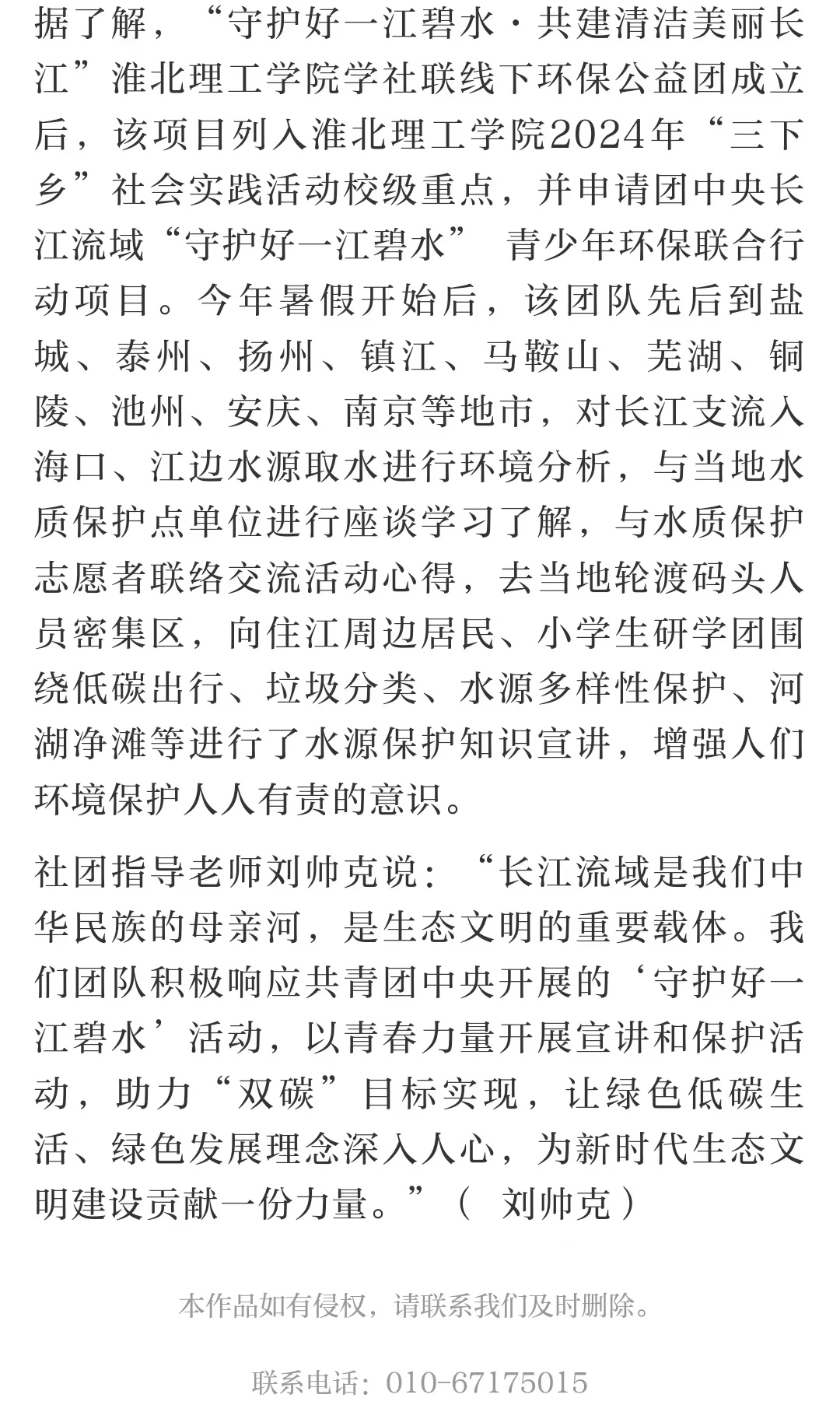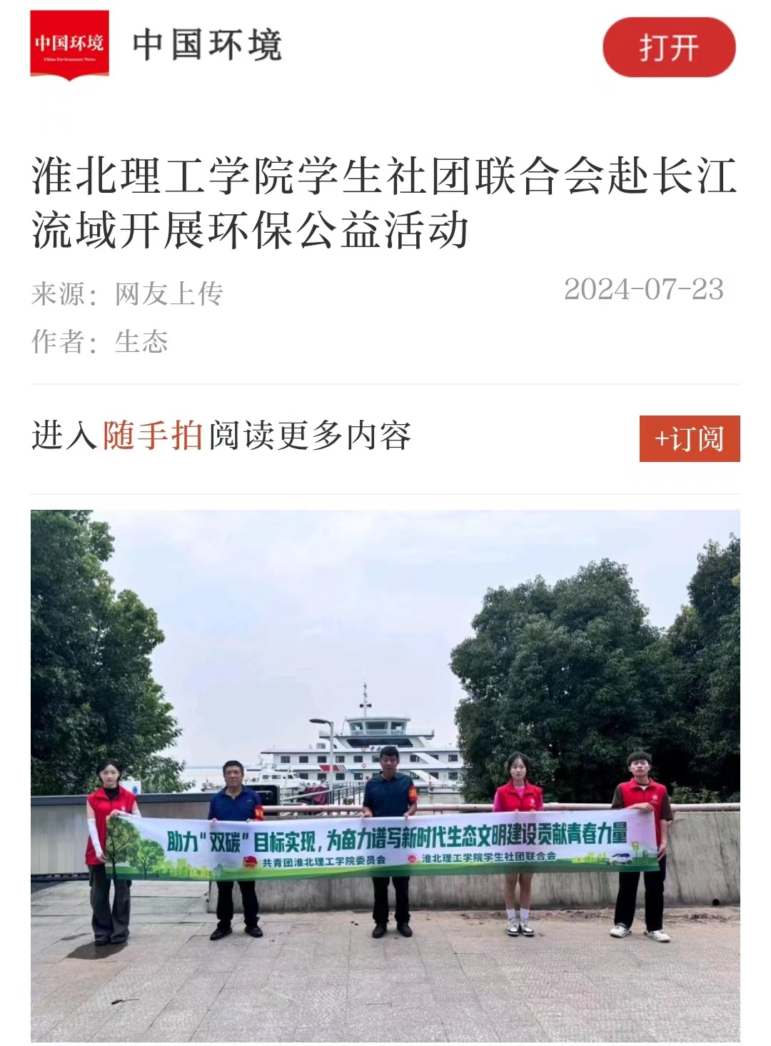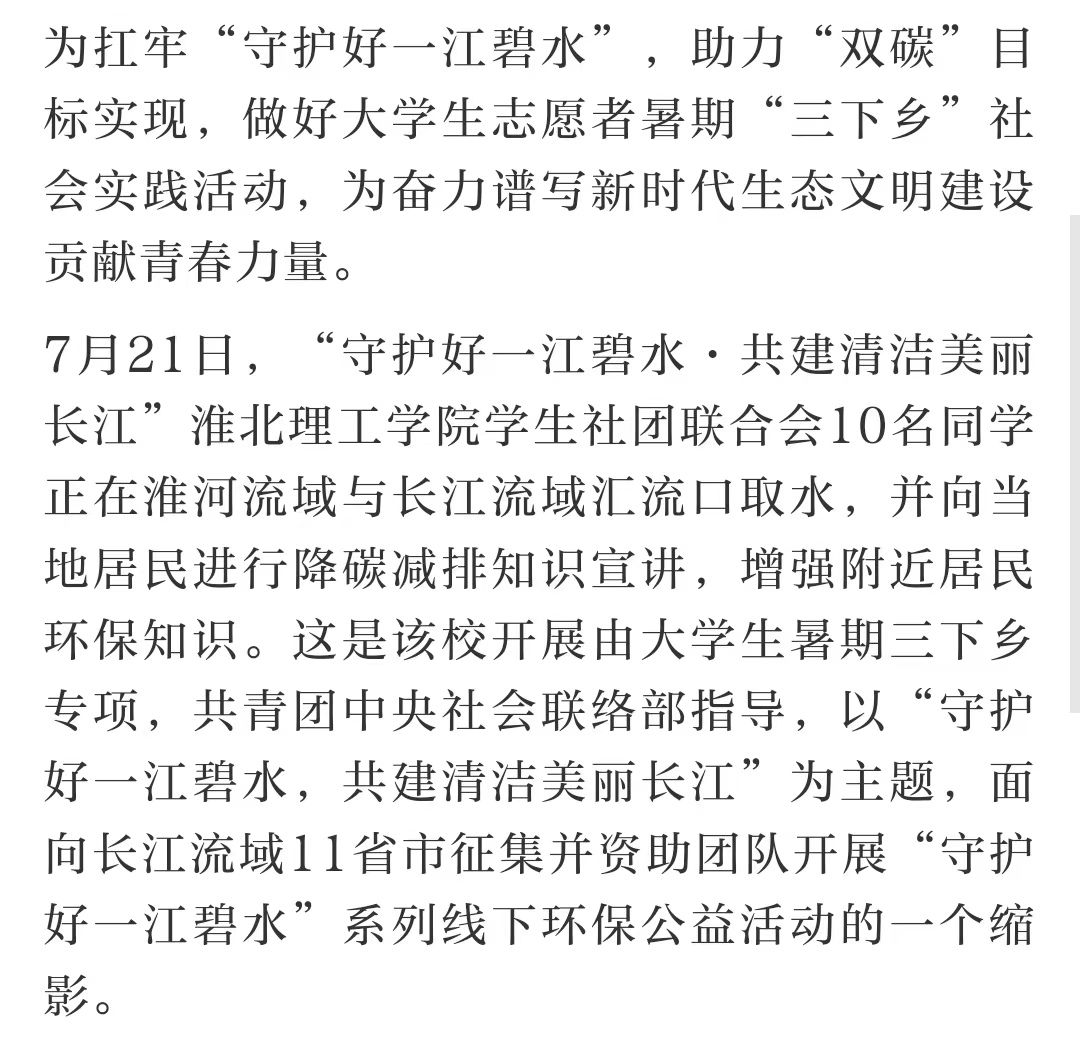 7月21日,“守护好一江碧水·共建清洁美丽长江”诸侯快讯入口官网学生社团联合会10名同学正在淮河流域与长江流域汇流口取水,并向当地居民进行降碳减排知识宣讲,增强附近居民环保知识。这是该校开展由大学生暑期三下乡专项,共青团中央社会联络部指导,以“守护好一江碧水,共建清洁美丽长江”为主题,面向长江流域11省市征集并资助团队开展“守护好一江碧水”系列线下环保公益活动的一个缩影。对此,中国环境网进行了报道:
