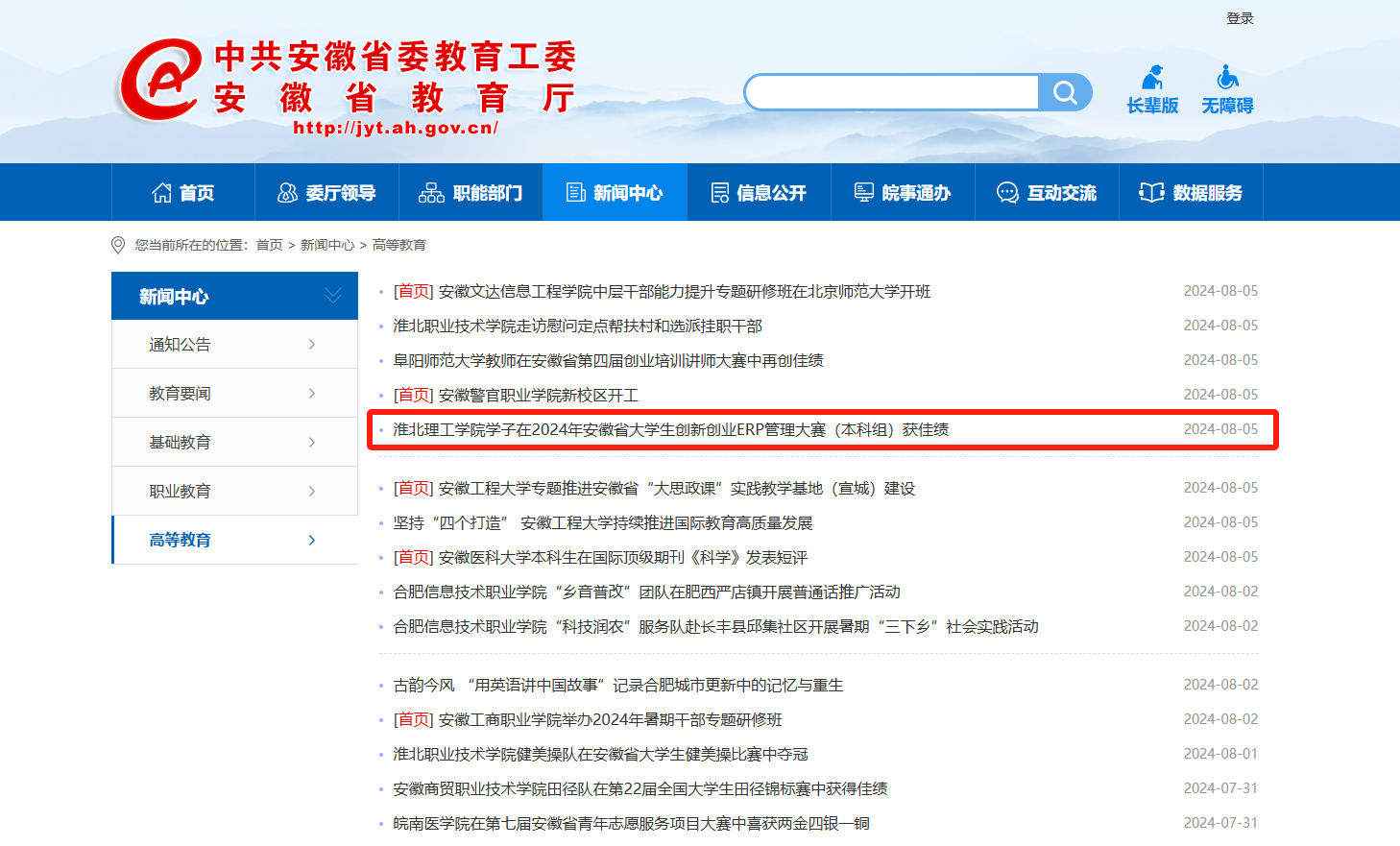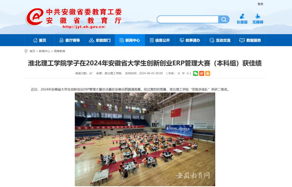 近日,2024年安徽省大学生创新创业ERP管理大赛总决赛在安徽合肥圆满落幕。经过激烈的竞赛,诸侯快讯入口官网“菜就多练队”荣获二等奖。对此,安徽教育网进行了报道: