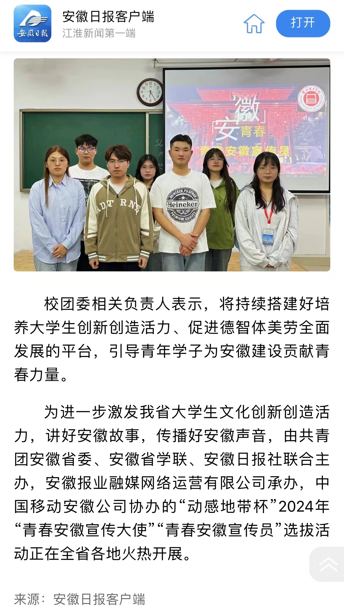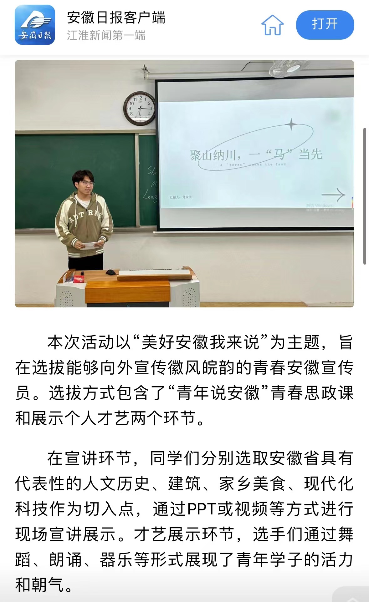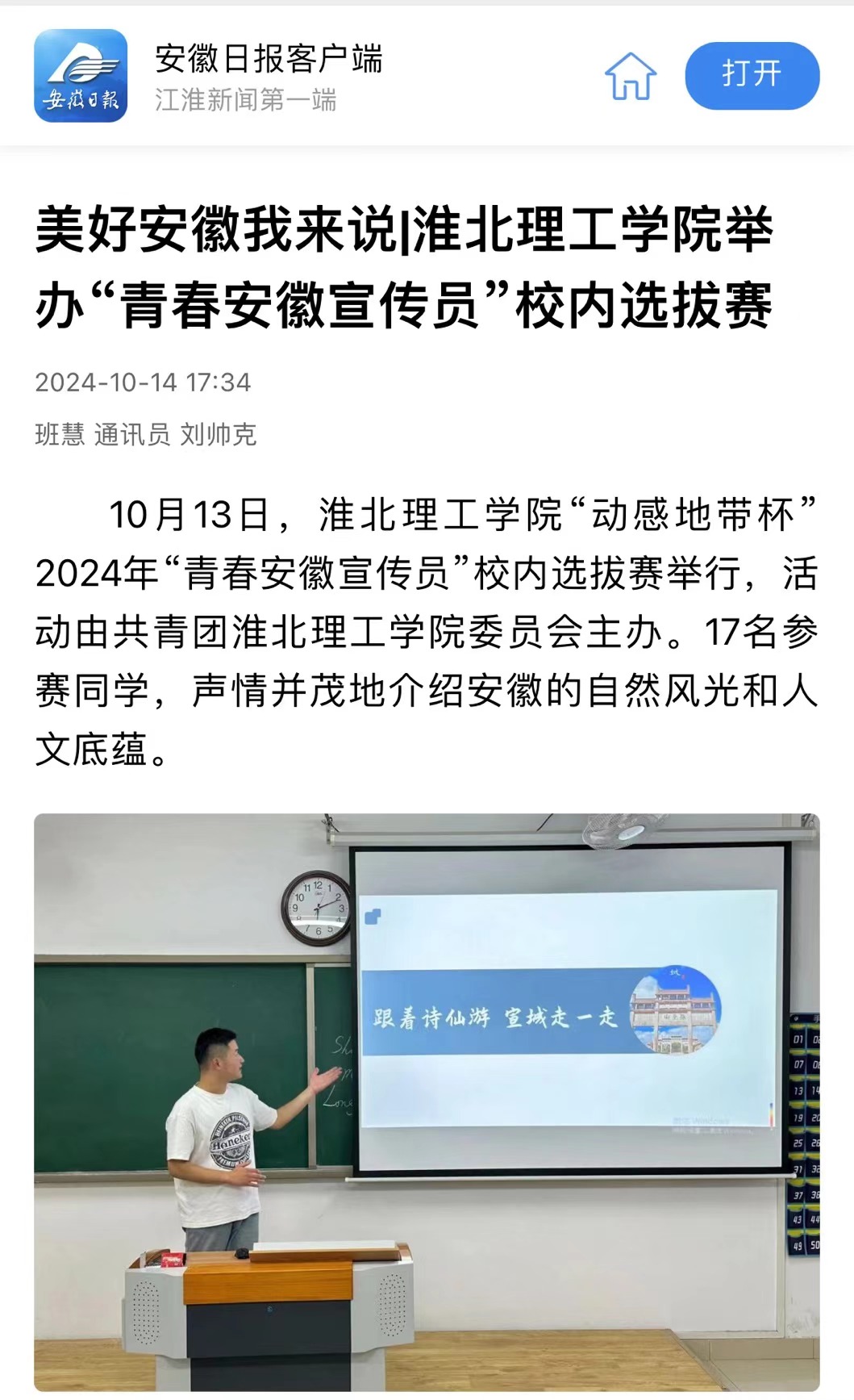 10月13日,诸侯快讯入口官网“动感地带杯”2024年“青春安徽宣传员”校内选拔赛举行,活动由共青团诸侯快讯入口官网委员会主办。17名参赛同学,声情并茂地介绍安徽的自然风光和人文底蕴。对此,安徽日报进行了报道: