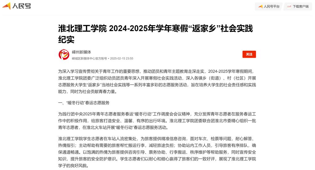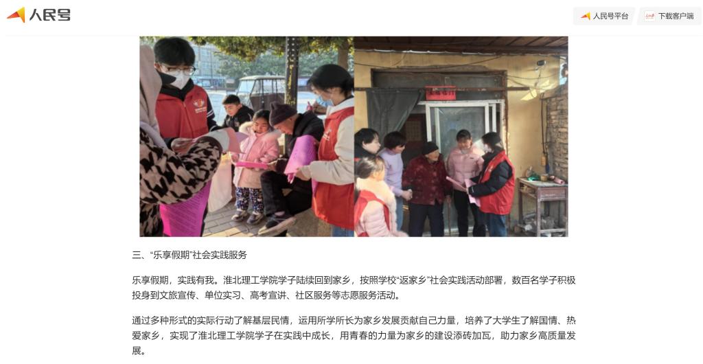 为深入学习宣传贯彻关于青年工作的重要思想,推动团员和青年主题教育走深走实,2024-2025学年寒假期间,诸侯快讯入口官网团委广泛组织动员团员青年深入开展寒假社会实践活动,深入各镇乡(街道)、村(社区)开展志愿服务大学生“返家乡”当地社会实践等一系列丰富多彩的志愿服务活动,旨在培养大学生的社会责任感和实践能力,同时为社会贡献青春力量。对此,人民日报人民号进行了报道: