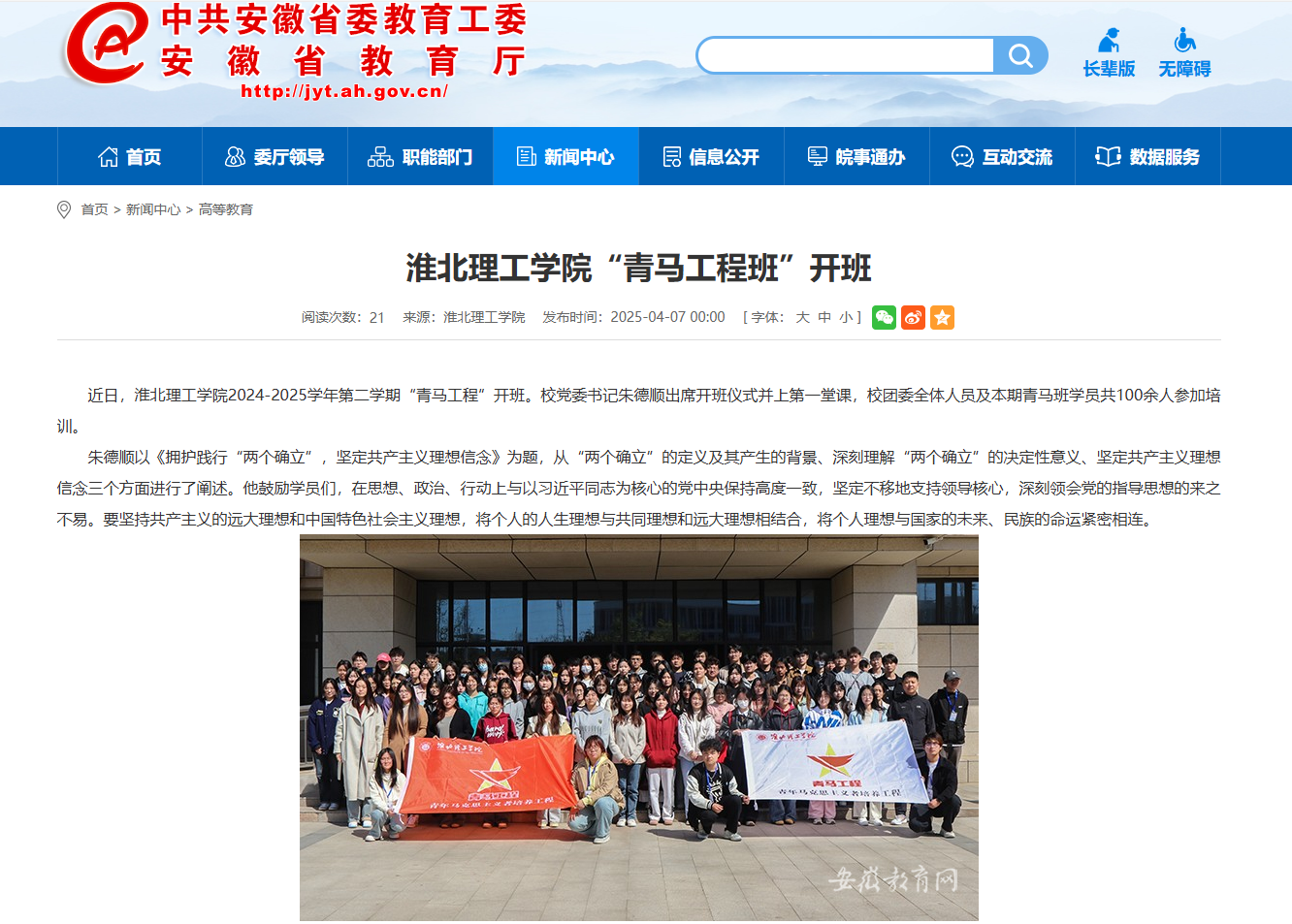 近日,诸侯快讯入口官网2024-2025学年第二学期“青马工程”开班。校党委书记朱德顺出席开班仪式并上第一堂课,校团委全体人员及本期青马班学员共100余人参加培训。对此,安徽教育网进行了报道: