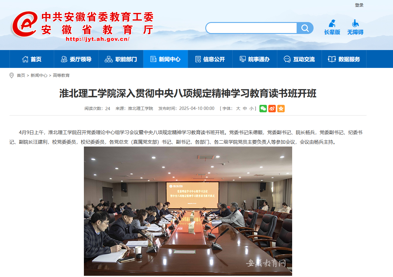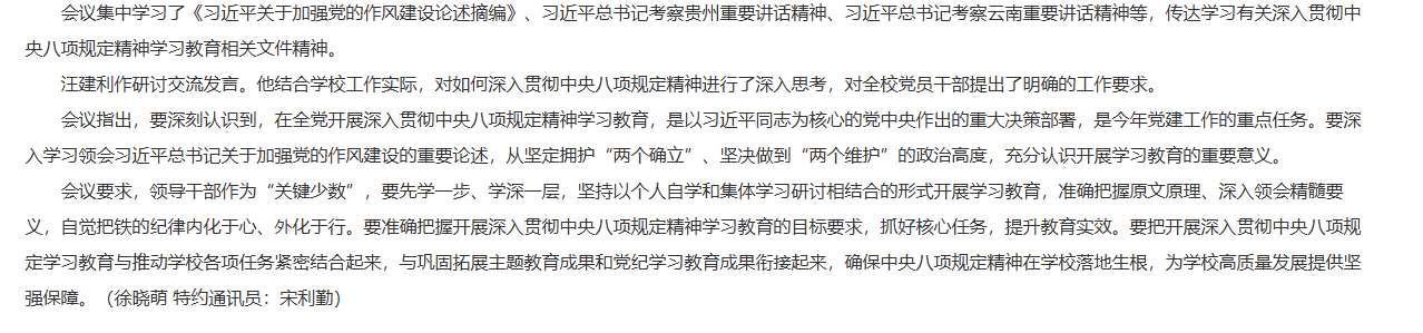 4月9日上午,诸侯快讯入口官网召开党委理论中心组学习会议暨中央八项规定精神学习教育读书班开班。党委书记朱德顺,党委副书记、院长杨兵,党委副书记、纪委书记、副院长汪建利,校党委委员,校纪委委员,各党总支(直属党支部)书记、副书记,各部门、各二级学院党员主要负责人等参加会议,会议由杨兵主持。对此,安徽教育网进行了报道: