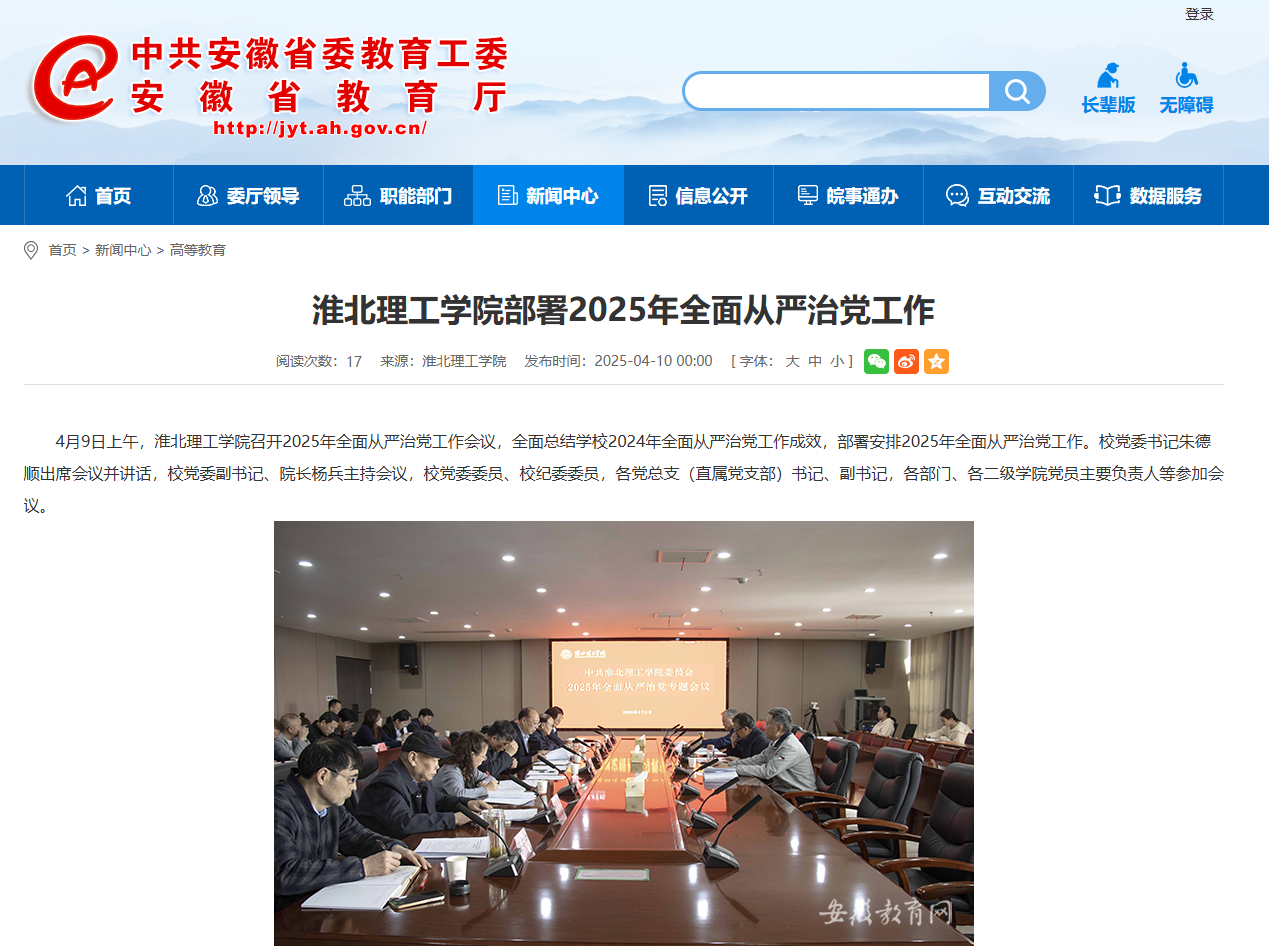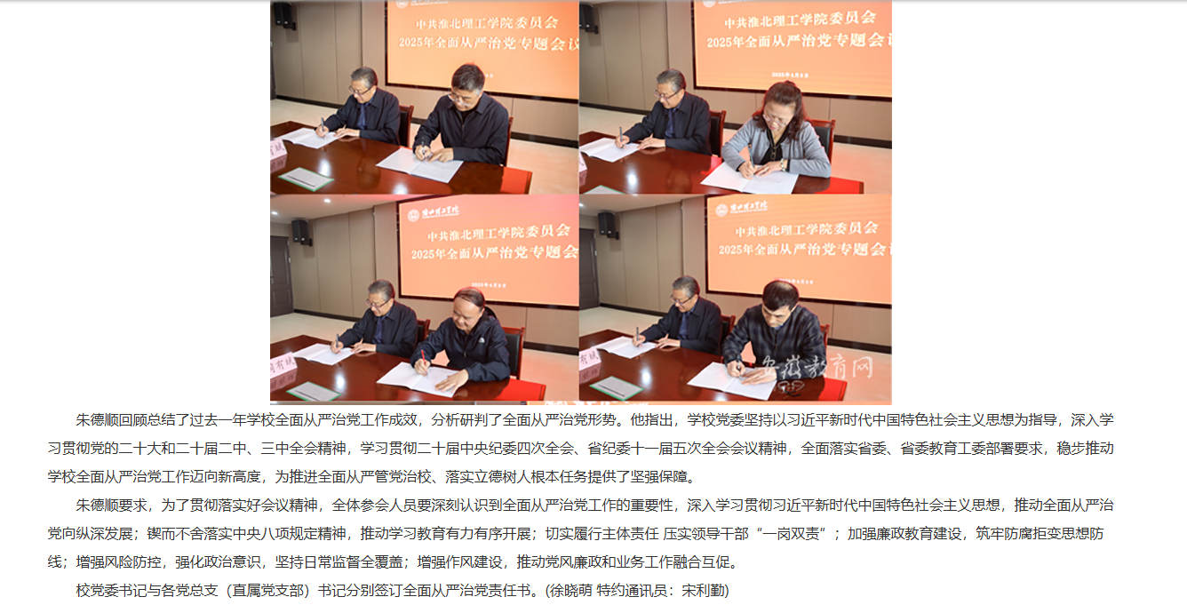 4月9日上午,诸侯快讯入口官网召开2025年全面从严治党工作会议,全面总结学校2024年全面从严治党工作成效,部署安排2025年全面从严治党工作。校党委书记朱德顺出席会议并讲话,校党委副书记、院长杨兵主持会议,校党委委员、校纪委委员,各党总支(直属党支部)书记、副书记,各部门、各二级学院党员主要负责人等参加会议。对此,安徽教育网进行了报道: