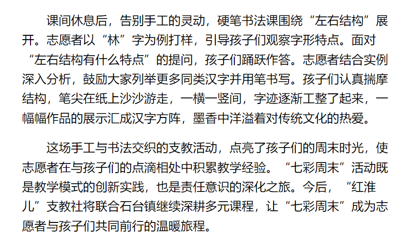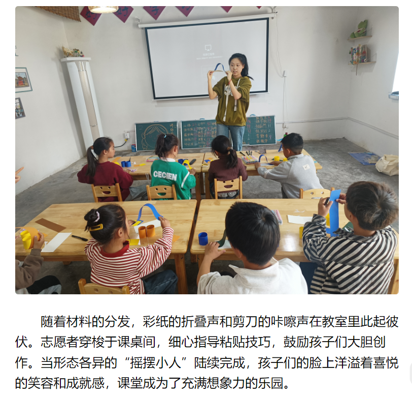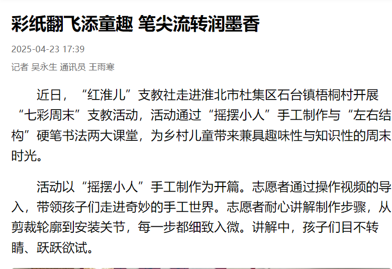 近日,“红淮儿”支教社走进淮北市杜集区石台镇梧桐村开展“七彩周末”支教活动,活动通过“摇摆小人”手工制作与“左右结构”硬笔书法两大课堂,为乡村儿童带来兼具趣味性与知识性的周末时光。对此,安徽日报进行了报道: