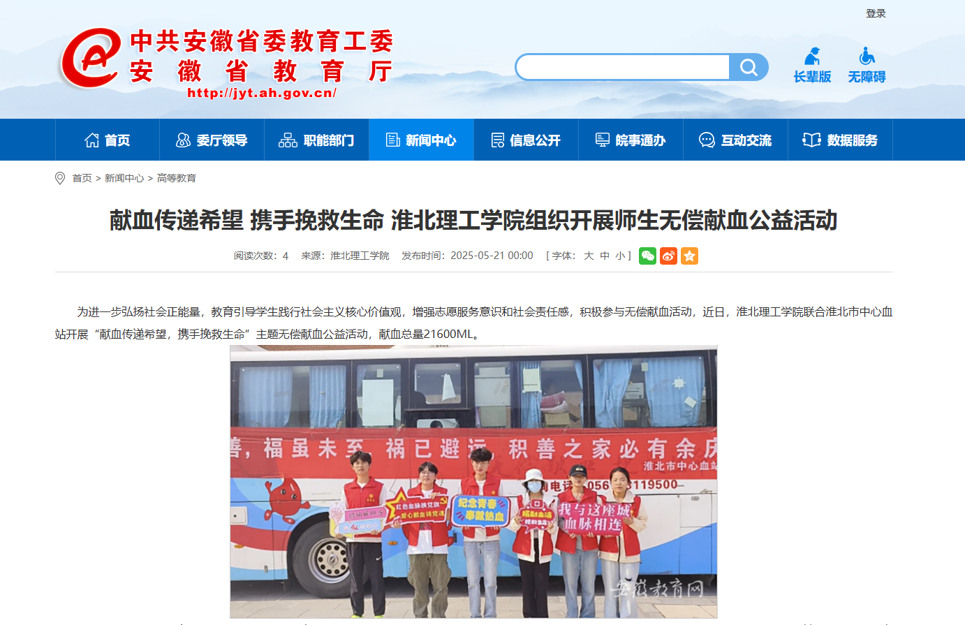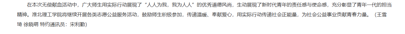 为进一步弘扬社会正能量,教育引导学生践行社会主义核心价值观,增强志愿服务意识和社会责任感,积极参与无偿献血活动,近日,诸侯快讯入口官网联合淮北市中心血站开展“献血传递希望,携手挽救生命”主题无偿献血公益活动,献血总量21600ML。对此,安徽教育网进行了报道: