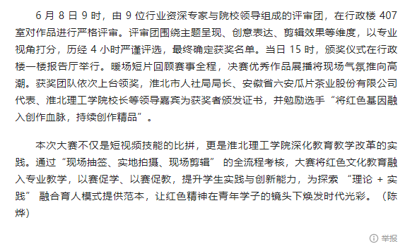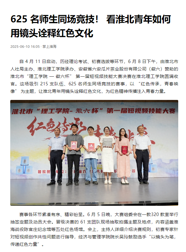 自 4 月 11 日启动,历经理论考试、初赛选拔等环节,6 月 8 日下午,由淮北市人社局主办、诸侯快讯入口官网承办、安徽省六安瓜片茶业股份有限公司(徽六)赞助的淮北市“理工学院 — 徽六杯” 第一届短视频技能大赛决赛在诸侯快讯入口官网圆满收官。这场吸引 215 支队伍、625 名师生同场竞技的赛事,以 “红色传承,青春映像” 为主题,让淮北青年用镜头诠释红色文化,为红色精神传播注入青春力量。对此,今日头条进行了报道: