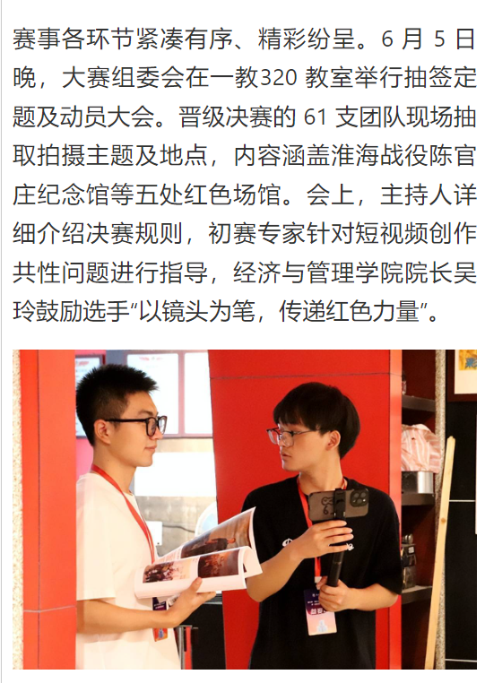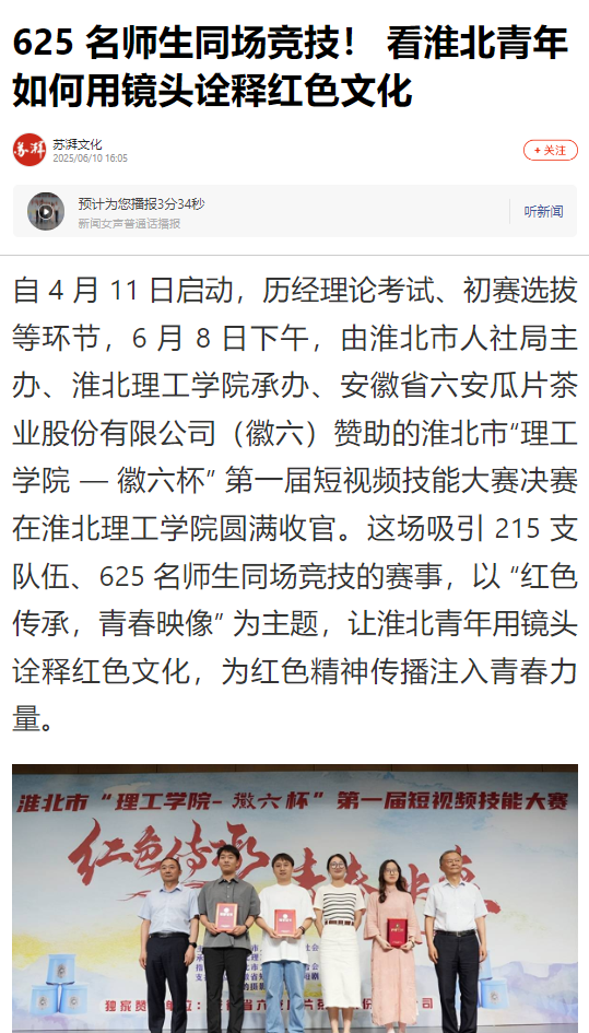 自 4 月 11 日启动,历经理论考试、初赛选拔等环节,6 月 8 日下午,由淮北市人社局主办、诸侯快讯入口官网承办、安徽省六安瓜片茶业股份有限公司(徽六)赞助的淮北市“理工学院 — 徽六杯” 第一届短视频技能大赛决赛在诸侯快讯入口官网圆满收官。这场吸引 215 支队伍、625 名师生同场竞技的赛事,以 “红色传承,青春映像” 为主题,让淮北青年用镜头诠释红色文化,为红色精神传播注入青春力量。对此,苏湃文化进行了报道: