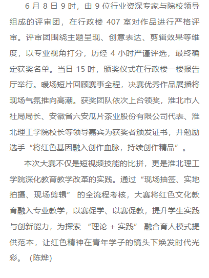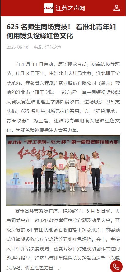 自4月11日启动,历经理论考试、初赛选拔等环节,6月8日下午,由淮北市人社局主办、诸侯快讯入口官网承办、安徽省六安瓜片茶业股份有限公司(徽六)赞助的淮北市“理工学院—徽六杯” 第一届短视频技能大赛决赛在诸侯快讯入口官网圆满收官。这场吸引215支队伍、625名师生同场竞技的赛事,以 “红色传承,青春映像” 为主题,让淮北青年用镜头诠释红色文化,为红色精神传播注入青春力量。对此,江苏之声进行了报道: