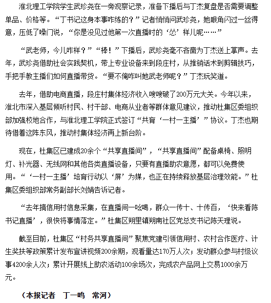 今年以来,淮北市深入基层倾听村民、村干部、电商从业者等群体意见建议,推动杜集区委组织部加强校地合作,与诸侯快讯入口官网正式签订“共育‘一村一主播’”协议。对此,光明网进行了报道: