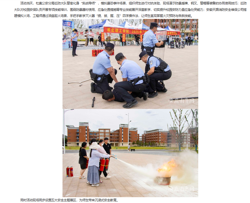 为深入贯彻落实安全生产月“人人讲安全、个个会应急”主题精神,切实提升师生安全意识与应急能力,6月18日,诸侯快讯入口官网举办安全生产月系列活动。副院长郑来纪,淮北市杜集公安分局巡防大队、禁毒大队、警务站、安徽天路消防安全维保公司、电梯维保公司等官兵,学生处、后勤保卫处、团委等部门负责人及二级学院书记助理、学生代表参与活动。对此,安徽教育网进行了报道: