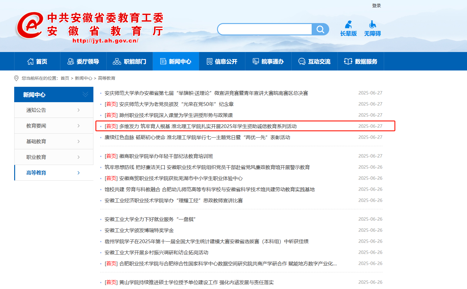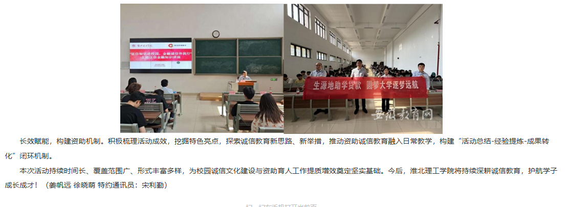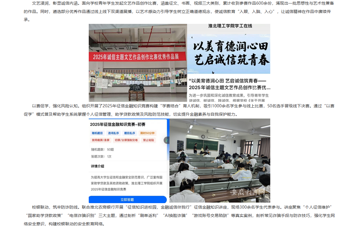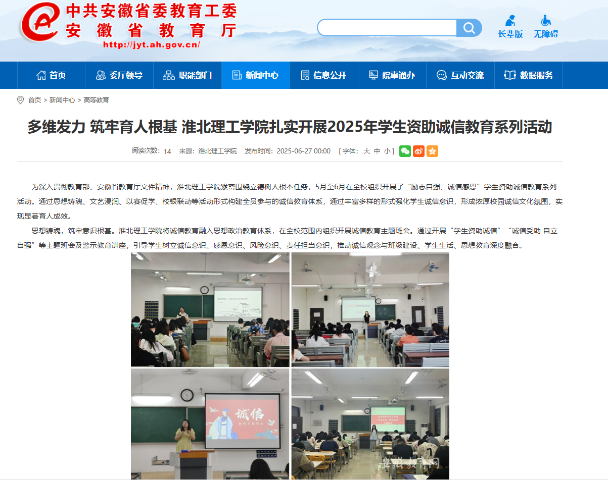 为深入贯彻教育部、安徽省教育厅文件精神,诸侯快讯入口官网紧密围绕立德树人根本任务,5月至6月在全校组织开展了“励志自强、诚信感恩”学生资助诚信教育系列活动。通过思想铸魂、文艺浸润、以赛促学、校银联动等活动形式构建全员参与的诚信教育体系,通过丰富多样的形式强化学生诚信意识,形成浓厚校园诚信文化氛围,实现显著育人成效。对此,安徽教育网进行了报道: