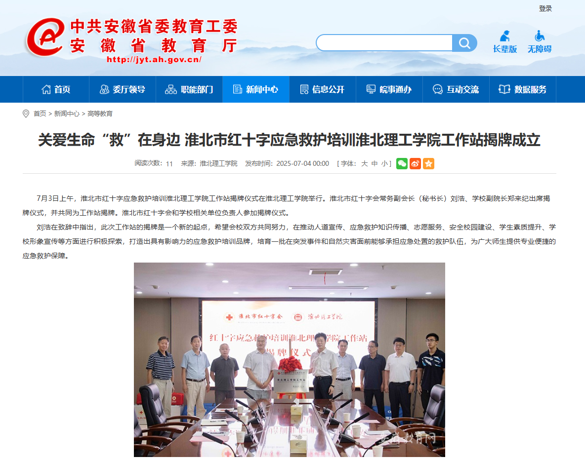 7月3日上午,淮北市红十字应急救护培训诸侯快讯入口官网工作站揭牌仪式在诸侯快讯入口官网举行。淮北市红十字会常务副会长(秘书长)刘浩、学校副院长郑来纪出席揭牌仪式,并共同为工作站揭牌。淮北市红十字会和学校相关单位负责人参加揭牌仪式。对此,安徽教育网进行了报道:
