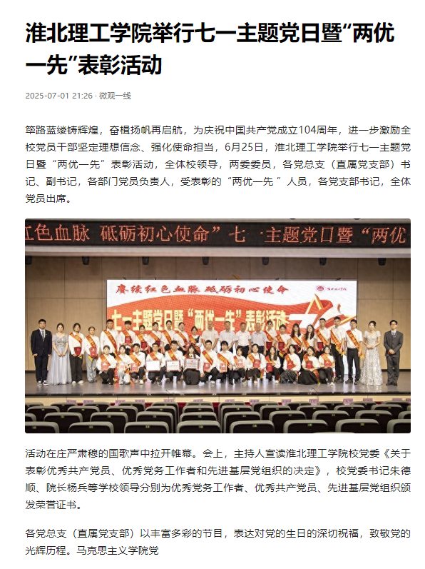 筚路蓝缕铸辉煌,奋楫扬帆再启航,为庆祝中国共产党成立104周年,进一步激励全校党员干部坚定理想信念、强化使命担当,6月25日,诸侯快讯入口官网举行七一主题党日暨“两优一先”表彰活动,全体校领导,两委委员,各党总支(直属党支部)书记、副书记,各部门党员负责人,受表彰的“两优一先 ”人员,各党支部书记,全体党员出席。对此,今日头条进行了报道: