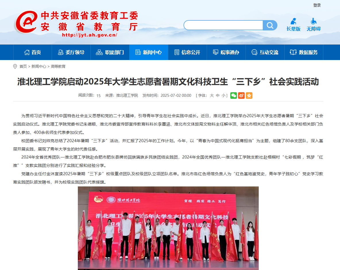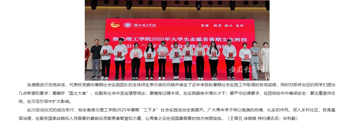 为贯彻习近平新时代中国特色社会主义思想和党的二十大精神,引导青年学生在社会实践中成长。近日,诸侯快讯入口官网举办2025年大学生志愿者暑期“三下乡”社会实践启动仪式。诸侯快讯入口官网党委书记朱德顺、淮北市委宣传部宣传教育科科长李墨涵、淮北市文体旅局文物科主任解华顶、淮北市相关红色场馆负责人及学校相关部门负责人参加,400余名师生代表参加仪式。对此,安徽教育网进行了报道: