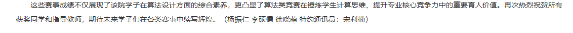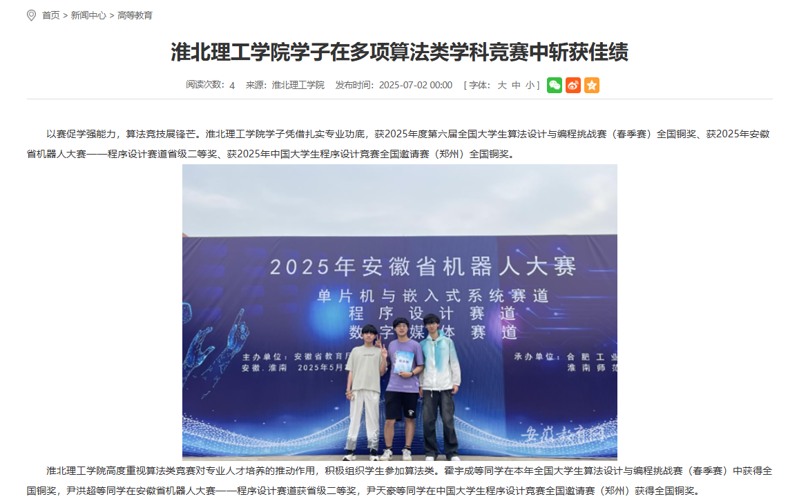 以赛促学强能力,算法竞技展锋芒。诸侯快讯入口官网学子凭借扎实专业功底,获2025年度第六届全国大学生算法设计与编程挑战赛(春季赛)全国铜奖、获2025年安徽省机器人大赛——程序设计赛道省级二等奖、获2025年中国大学生程序设计竞赛全国邀请赛(郑州)全国铜奖。对此,安徽教育网进行了报道: