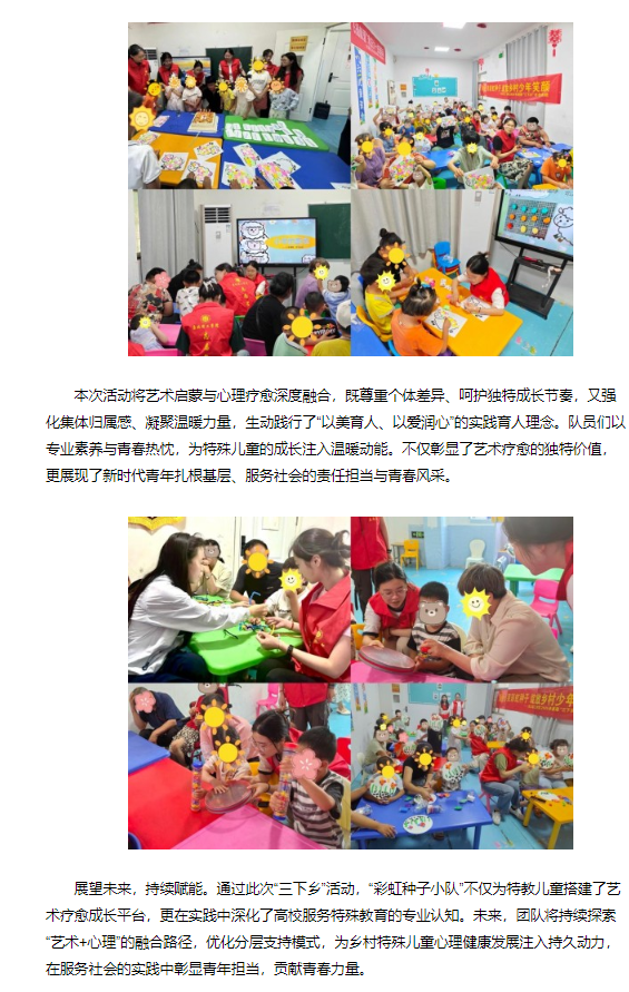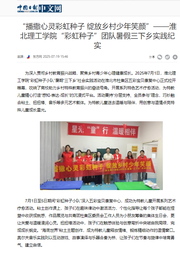 为深入贯彻乡村教育振兴战略,聚焦乡村青少年心理健康成长。2025年7月1日,诸侯快讯入口官网“彩虹种子小队”暑期“三下乡”社会实践活动在淮北市杜集区五彩宝贝康复中心正式拉开帷幕,吹响了高校助力乡村特殊教育振兴的奋进号角。开展系列特色艺术疗愈活动,为特教儿童精心打造“感知-表达-成长”的沉浸式平台。活动秉持“分层支持、全员参与”理念,巧妙融合粘土、扭扭棒、音乐等多元艺术载体。为特教儿童送去温暖与陪伴,用创意与温情点亮特殊儿童成长星光。对此,中国日报网进行了报道: