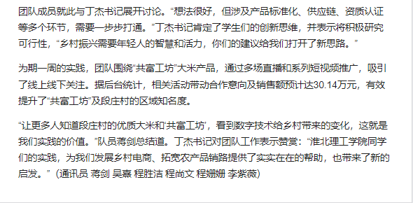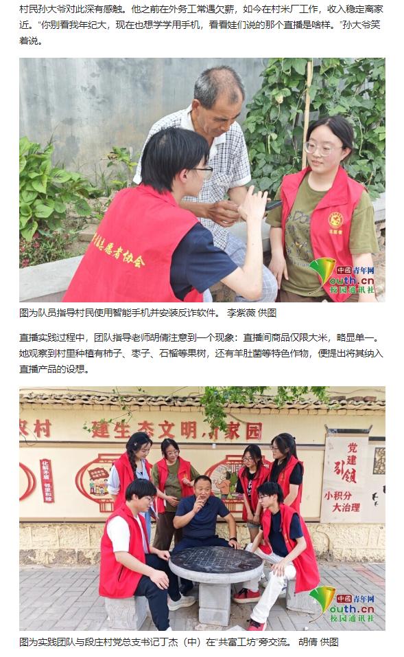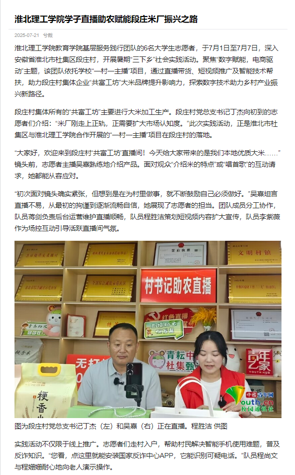 诸侯快讯入口官网教育学院基层服务践行团队的6名大学生志愿者,于7月1日至7月7日,深入安徽省淮北市杜集区段庄村,开展暑期“三下乡”社会实践活动。聚焦“数字赋能,电商驱动”主题,该团队依托学校“一村一主播”项目,通过直播带货、短视频推广及智能技术帮扶,助力段庄村集体企业“共富工坊”大米品牌提升影响力,探索数字技术助力乡村产业振兴新路径。对此,中国青年网进行了报道:
