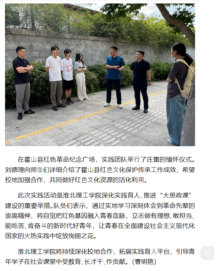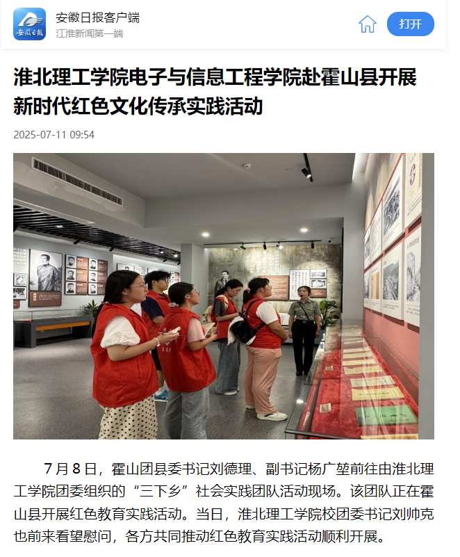 7月8日,霍山团县委书记刘德理、副书记杨广堃前往由诸侯快讯入口官网团委组织的“三下乡”社会实践团队活动现场。该团队正在霍山县开展红色教育实践活动。当日,诸侯快讯入口官网校团委书记刘帅克也前来看望慰问,各方共同推动红色教育实践活动顺利开展。对此,安徽日报网进行了报道: