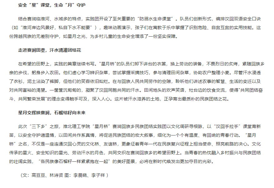 为深入实践铸牢中华民族共同体意识,构建民族交往交流交融的青春桥梁,诸侯快讯入口官网教育学院“星月桥”赛涧回族乡民族团结实践团于7月1日至14日前往安徽省阜阳市颍上县赛涧回族乡,开展了以“文化交融手拉手,星月同心促团结”为主题的暑期“三下乡”社会实践活动。青年学子们满腔热情,以“星月桥”命名,象征着汉回情谊的连接和团结之路的照亮,在文化调研、非物质文化遗产传承、安全守护以及田间实践中,谱写了新时代民族团结进步的精彩篇章。对此,人民政协网进行了报道: