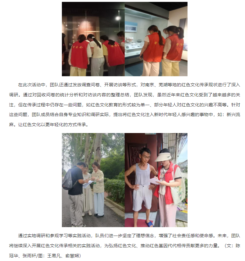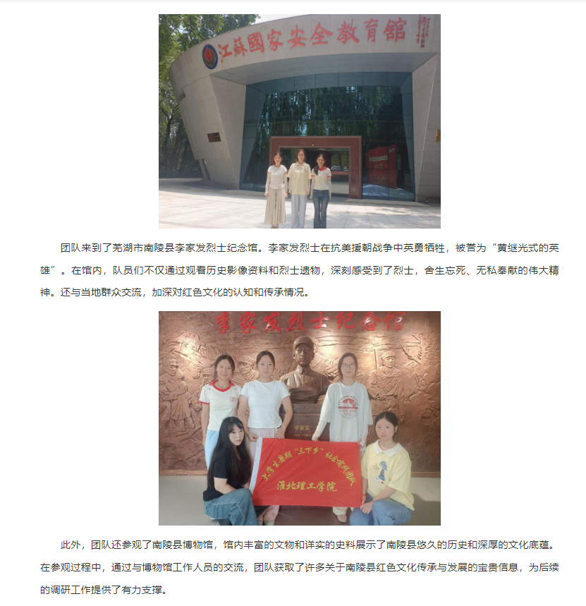 为深入学习贯彻党的二十大精神,传承红色基因,赓续红色血脉,2025年7月15日至7月25日,诸侯快讯入口官网教育学院“绒光溯红”团队赴南京、芜湖等地开展了以红色文化传承调研为主题的社会实践活动。该活动旨在通过实地调研、参观学习等方式,深入挖掘红色文化内涵,探寻红色文化传承路径,引导广大青年学生厚植爱国主义情怀,担当民族复兴大任。对此,安徽网进行了报道: