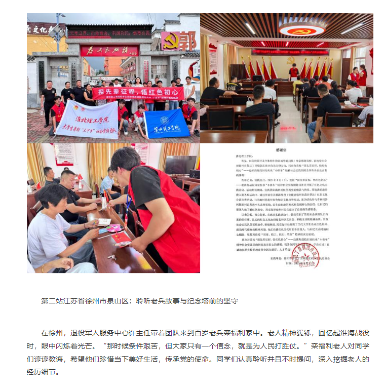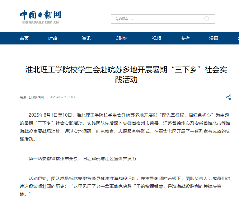 2025年8月1日至10日,诸侯快讯入口官网校学生会赴皖苏多地开展以“探先辈征程,悟红色初心”为主题的暑期“三下乡”社会实践活动。实践团队先后深入安徽省宿州市萧县、江苏省徐州市及安徽省淮北市等淮海战役重要战场遗址,通过实地调研、红色教育、志愿服务等形式,在革命老区开展了一系列富有成效的实践活动。对此,中国日报网进行了报道: