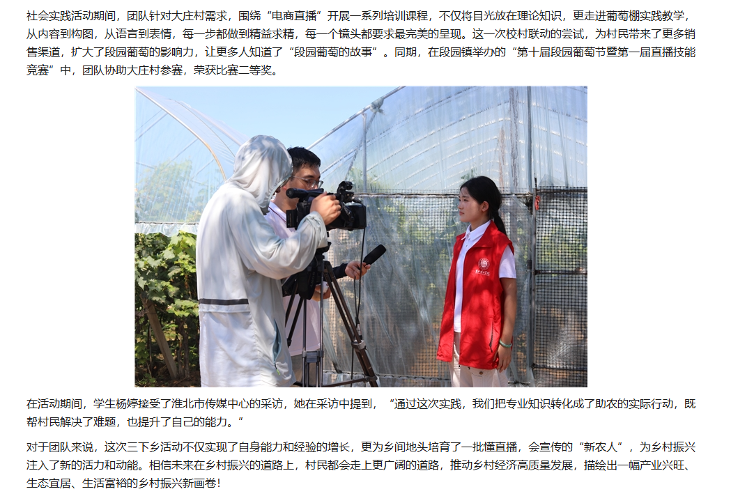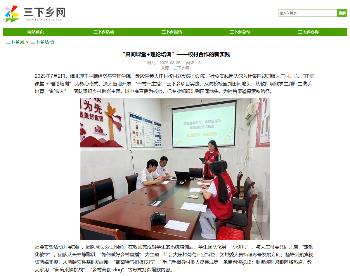 2025年7月2日,诸侯快讯入口官网经济与管理学院“赴段园镇大庄村校村联动爱心助农“社会实践团队深入杜集区段园镇大庄村,以 “田间课堂 + 理论培训” 为核心模式,深入当地开展 “一村一主播” 三下乡项目实践。从高校校园到田间地头,从教师赋能学生到师生携手培育 “新农人”,团队紧扣乡村振兴主题,以电商直播为核心,把专业知识带到田间地头,为销售渠道探索新路径。对此,三下乡网进行了报道: