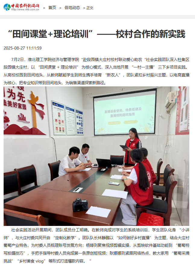 7月2日,诸侯快讯入口官网经济与管理学院“赴段园镇大庄村校村联动爱心助农“社会实践团队深入杜集区段园镇大庄村,以“田间课堂 +理论培训”为核心模式,深入当地开展“一村一主播”三下乡项目实践。从高校校园到田间地头,从教师赋能学生到师生携手培育“新农人”,团队紧扣乡村振兴主题,以电商直播为核心,把专业知识带到田间地头,为销售渠道探索新路径。对此,中国农科新闻网进行了报道: