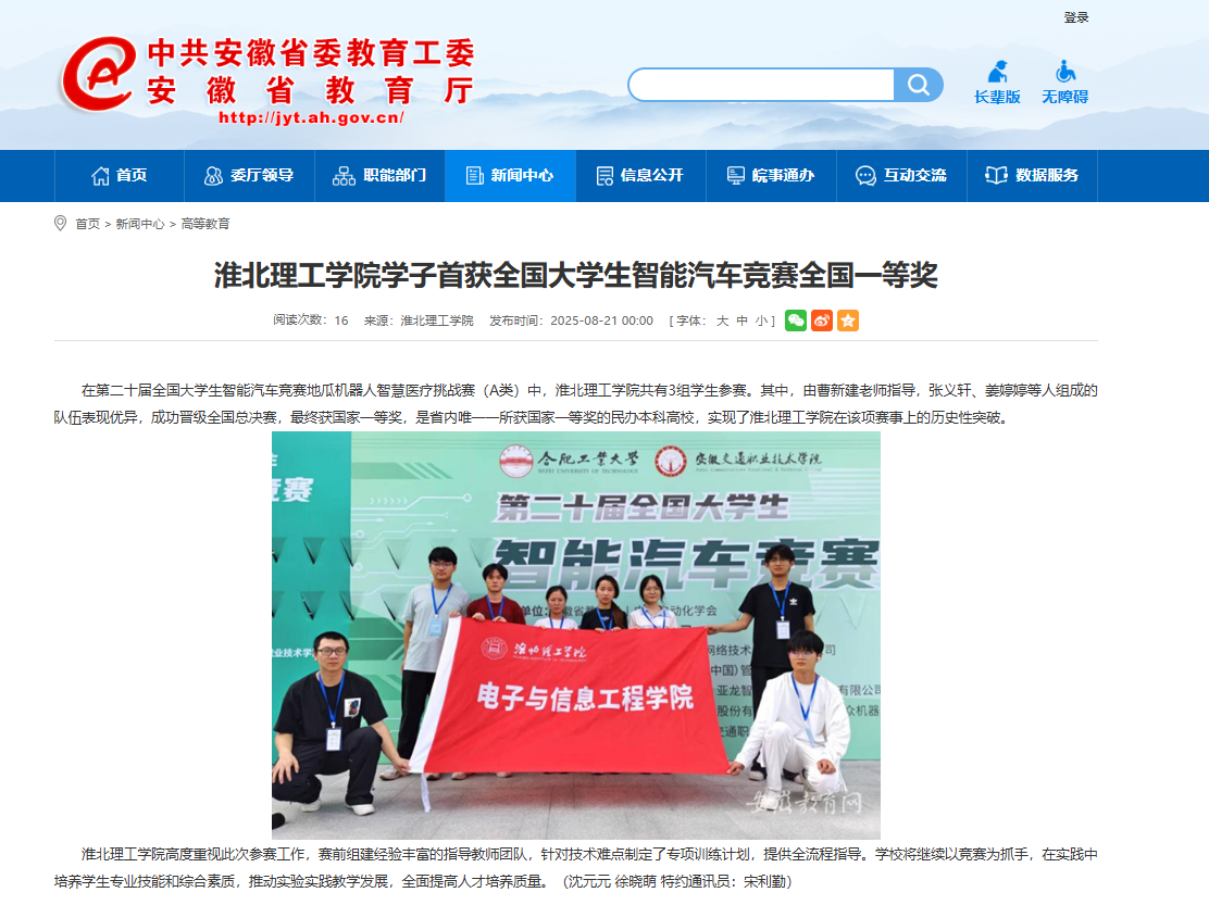 在第二十届全国大学生智能汽车竞赛地瓜机器人智慧医疗挑战赛(A类)中,诸侯快讯入口官网共有3组学生参赛。其中,由曹新建老师指导,张义轩、姜婷婷等人组成的队伍表现优异,成功晋级全国总决赛,最终获国家一等奖,是省内唯一一所获国家一等奖的民办本科高校,实现了诸侯快讯入口官网在该项赛事上的历史性突破。对此,安徽教育网进行了报道: