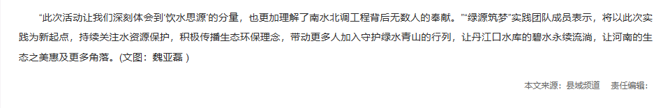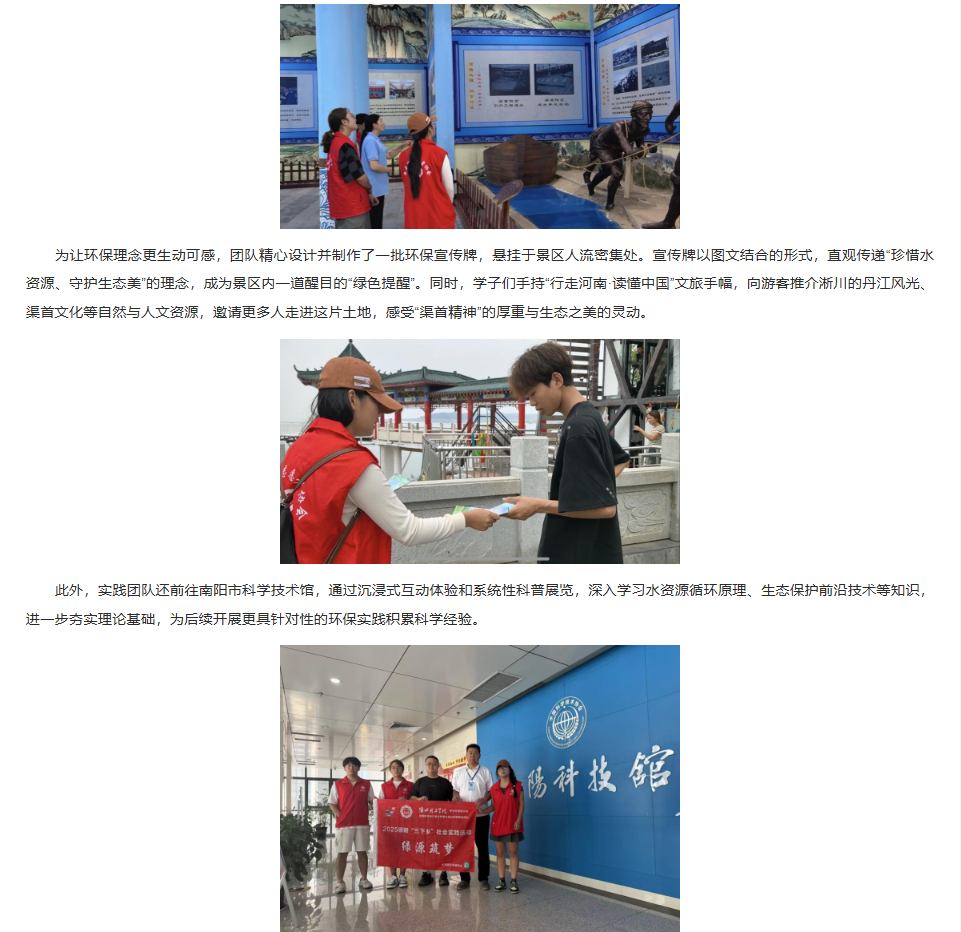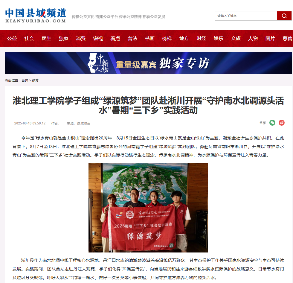 今年是“绿水青山就是金山银山”理念提出20周年,8月15日全国生态日以“绿水青山就是金山银山”为主题,凝聚全社会生态保护共识。在此背景下,8月7日至13日,诸侯快讯入口官网常青藤志愿者协会的河南籍学子组建“绿源筑梦”实践团队,奔赴河南省南阳市淅川县,开展以“守护绿水青山”为主题的暑期“三下乡”社会实践活动。学子们以实际行动践行生态理念,传承南水北调精神,为水源保护与环保宣传注入青春力量。对此,中国县域频道进行了报道:
